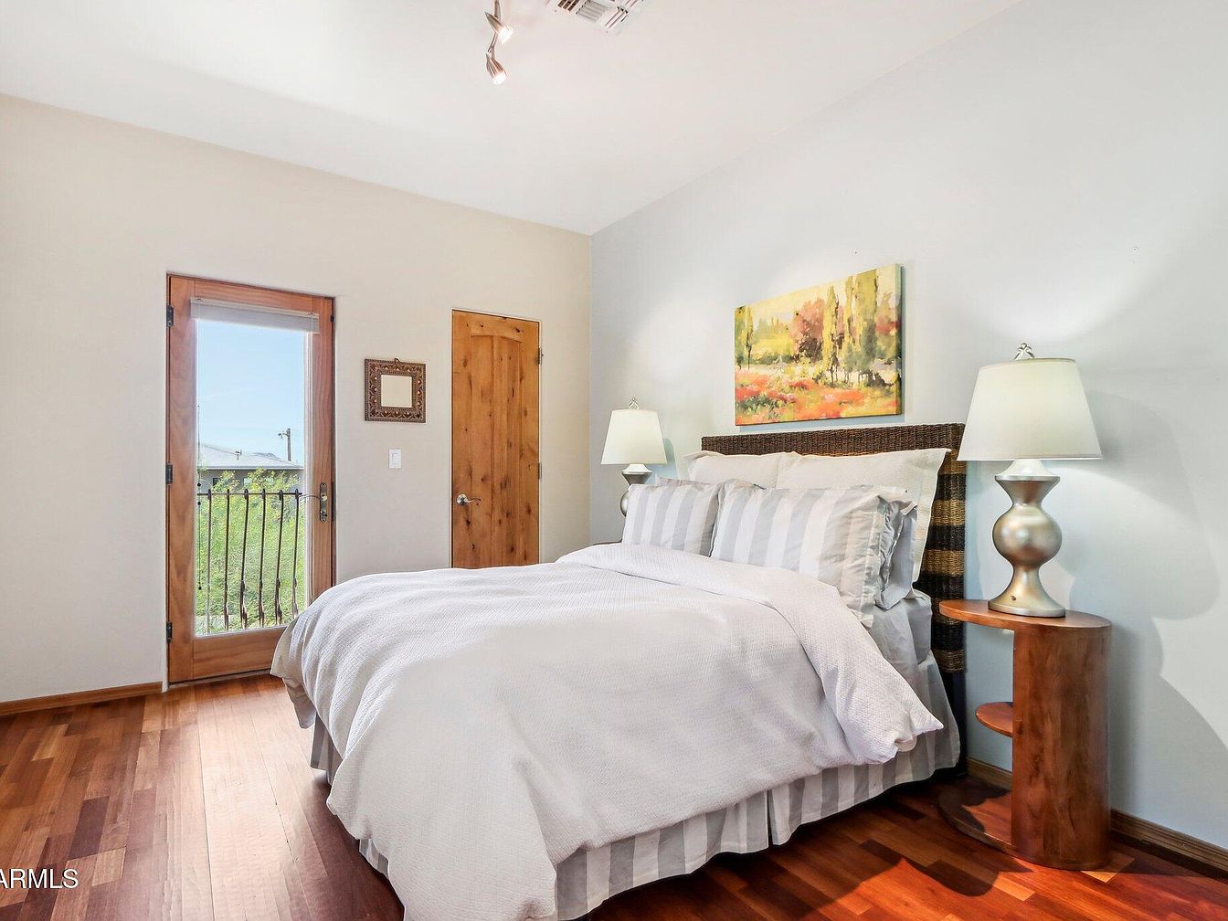 This serene bedroom features a warm, natural wood floor that contrasts softly with light neutral walls. A textured woven headboard anchors the bed, which is dressed in crisp white and pale gray striped bedding for a clean, airy feel. Two silver-toned table lamps with white shades stand on small wooden side tables, adding a blend of elegance and rustic charm. A vibrant landscape painting above the bed introduces subtle pops of colorful warmth. A tall glass door with wood trim opens outward, providing access to a balcony and offering natural light and scenic views, enhancing the room’s tranquil atmosphere.