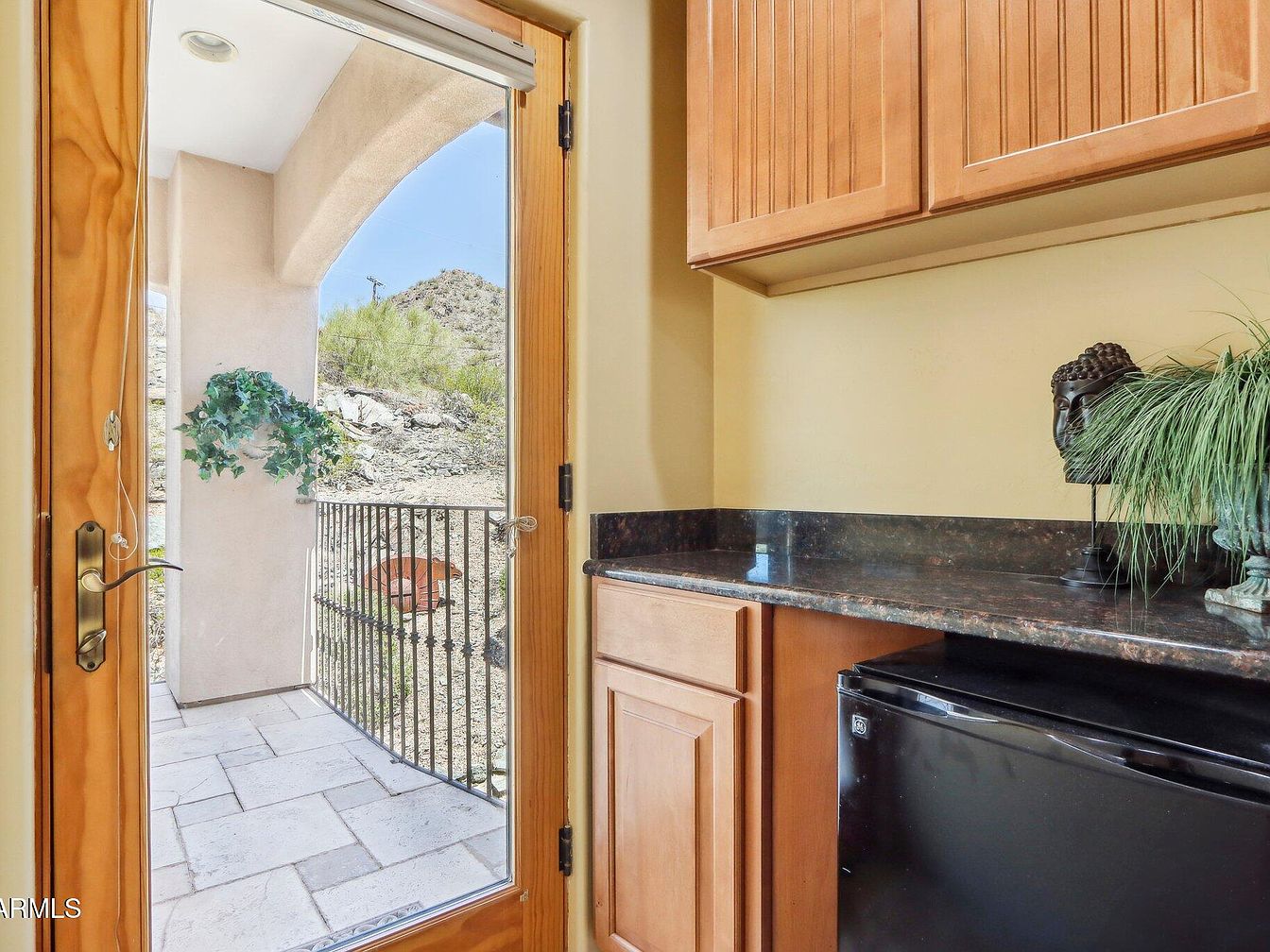 This cozy space features a wooden-framed glass door that opens onto a small patio with stone tile flooring and a wrought-iron railing, blending indoor and outdoor living. The warm beige walls complement the natural wood cabinetry with paneled doors, creating a welcoming and earthy tone. The dark granite countertop adds a polished contrast above a compact black mini-fridge. Decorative touches include a potted green plant and a sculptural dark Buddha head, which inject a sense of tranquility and subtle sophistication into the area. The design promotes a seamless transition from kitchen or utility space to serene outdoor surroundings.