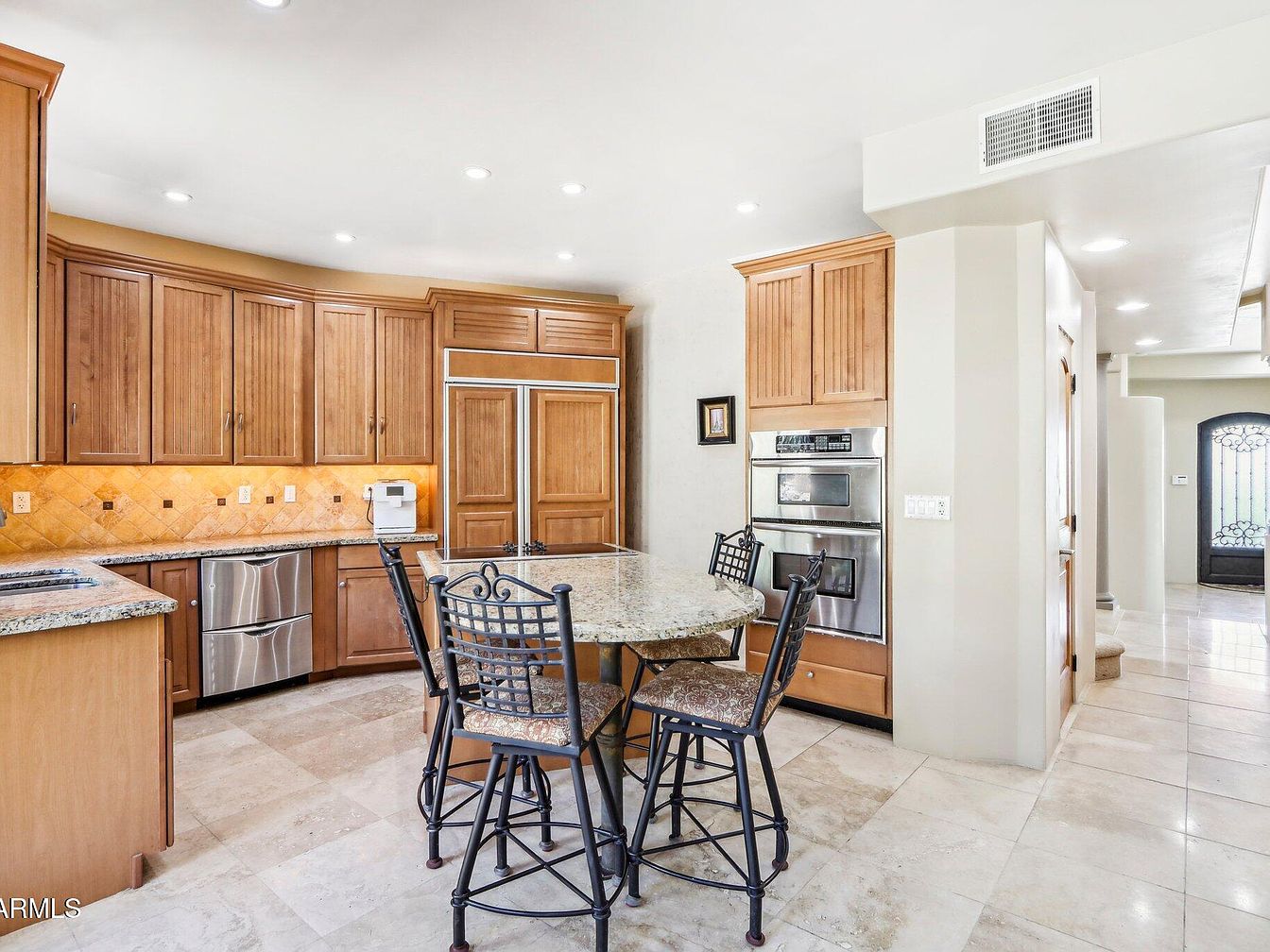 This kitchen dining nook combines warm wood cabinetry with cool stone countertops and a tiled backsplash, creating a balanced and inviting space. The L-shaped arrangement of cabinets provides ample storage, featuring a built-in oven and a refrigerator paneled to blend seamlessly with the cabinetry. Above, the ceiling is equipped with recessed lighting that illuminates the space evenly. The granite-topped dining table, supported by a single pedestal base, is surrounded by metal-framed chairs with cushioned seats in a subtle pattern. The floor is covered in pale stone tiles, complementing the neutral color scheme and maintaining a clean, airy feel throughout.