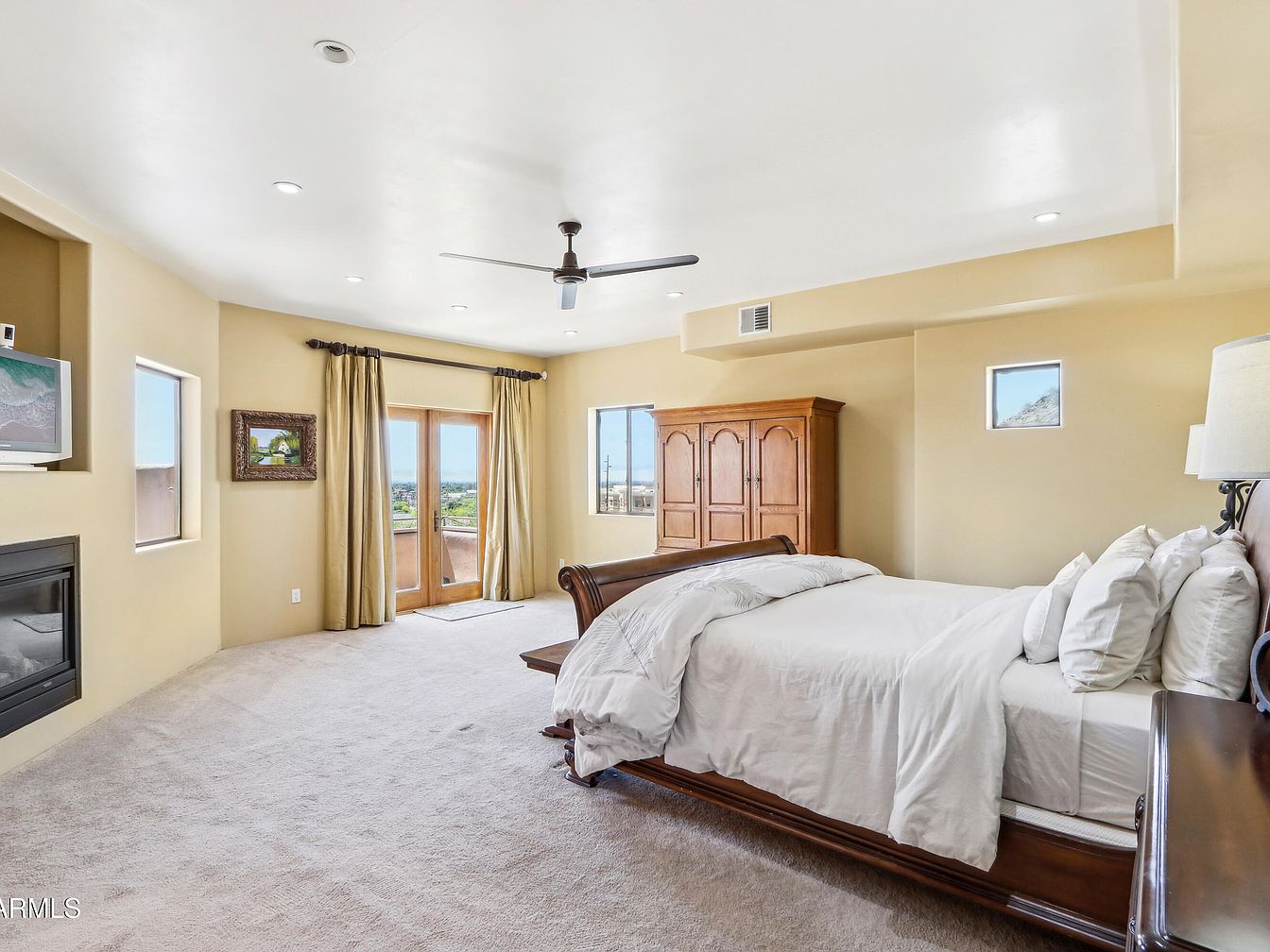This spacious bedroom features soft beige walls and a neutral carpet that creates a calm, inviting atmosphere. A large wooden sleigh bed with white bedding anchors the room, complemented by matching dark wood nightstands and a tall armoire. Recessed ceiling lights and a sleek ceiling fan ensure comfort and functionality. French doors draped in gold-toned curtains open onto a balcony, inviting natural light and offering scenic outdoor views. Architectural details include small square windows and a built-in niche housing a fireplace and flat-screen TV, blending classic design with modern convenience.