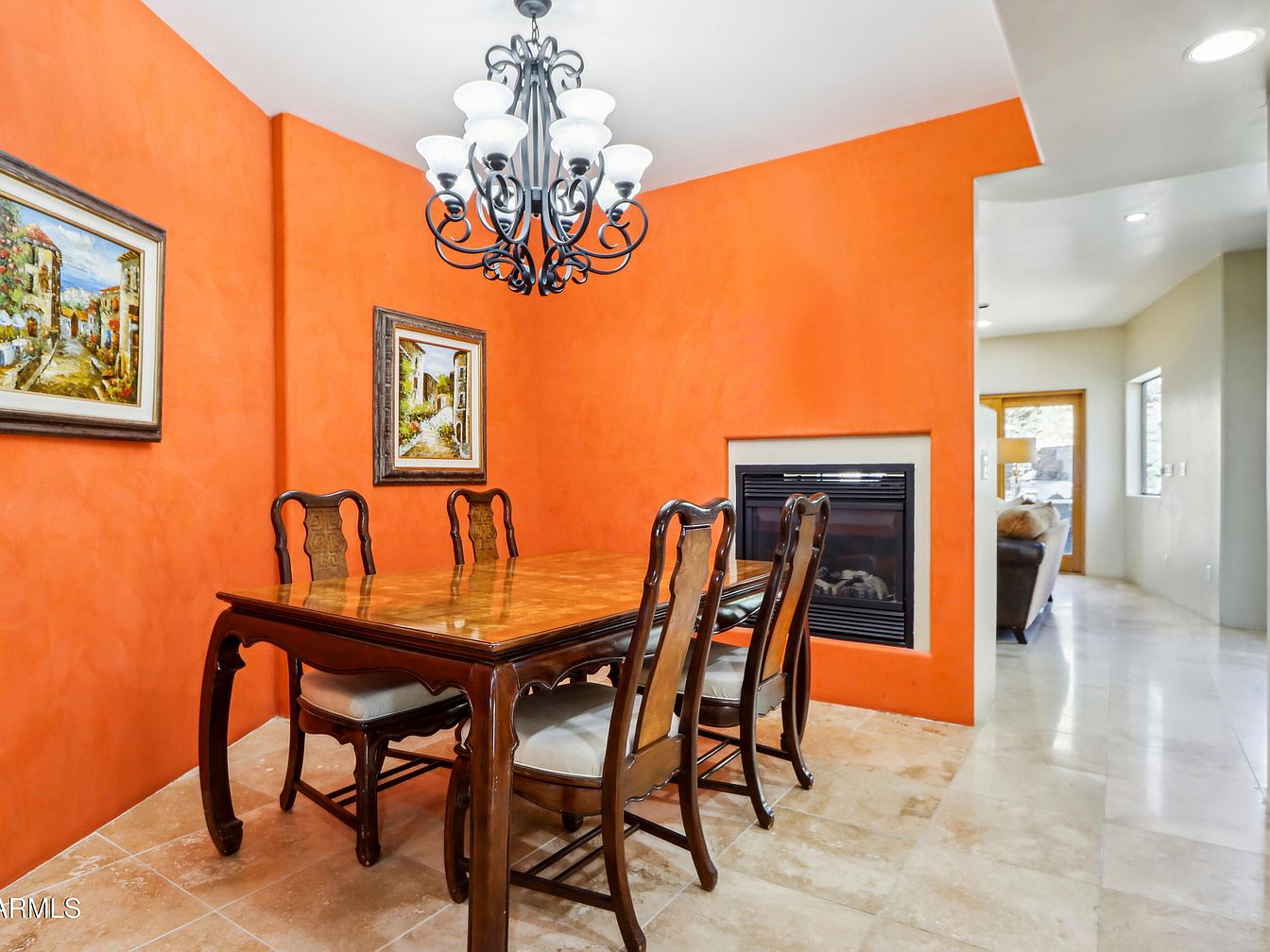 This dining area features a striking burnt orange accent wall that envelops the space with warmth and vibrancy. A dark wood dining table with polished finish sits centrally, surrounded by four matching chairs upholstered in neutral tones. The traditional design of the furniture contrasts beautifully with the modern fireplace embedded into the orange wall, adding both a cozy ambiance and architectural interest. Two framed paintings hang on the wall, enhancing the room’s artistic vibe. The floor is clad in smooth beige tiles, seamlessly connecting this open dining zone to the adjacent light-colored living area, visible through a wide opening.