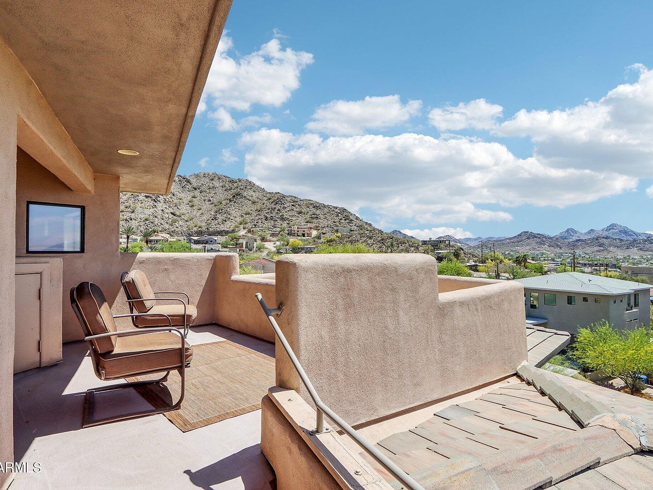 This balcony area offers a charming outdoor retreat with a southwestern architectural style, featuring smooth stucco walls in warm beige tones. Two vintage-style metal chairs with cushioned seats and backs sit atop a woven neutral rug, inviting relaxation while enjoying expansive mountain and suburban views under a clear blue sky dotted with soft clouds. The balcony’s parapet walls create a cozy enclosure, enhanced by an overhead ceiling with embedded lighting for evening ambiance. The natural earthy hues blend seamlessly with the desert landscape, while the layout emphasizes unobstructed scenic vistas and peaceful outdoor lounging.
