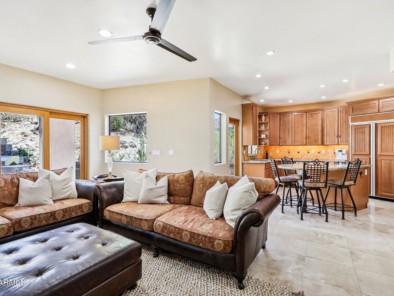 This open-concept living space features a harmonious blend of warm, earthy tones and neutral shades. The living area showcases two plush sofas with patterned upholstery in rust and orange hues paired with white accent pillows, contrasted by dark brown leather armrests and a large tufted leather ottoman that serves as a coffee table. Natural light floods through large windows and glass doors, illuminating the light beige walls and polished stone tile flooring. Adjacent to the living room, the kitchen highlights wooden cabinetry with a classic honey oak finish and a spacious island with black wrought iron stools, perfect for casual dining. Recessed ceiling lights and a modern ceiling fan add to the room’s comfort and airiness.