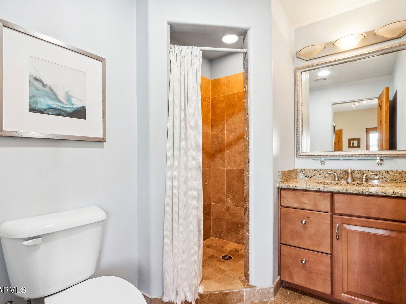 This compact bathroom blends functionality with warm, natural tones. The shower niche is framed with tan, textured stone tiles that create an inviting earthy ambiance, complemented by a simple white curtain for privacy. Adjacent to the shower, a granite countertop with beige and brown flecks sits atop rich wooden cabinetry, housing drawers and a cabinet for storage. Above the vanity, a large silver-framed mirror reflects the light, lined by three shell-shaped sconces that add subtle elegance. Soft gray walls contrast gently with the white toilet and the splash of blue and black hues in the abstract artwork above it. The layout balances efficient use of space and warm design elements.