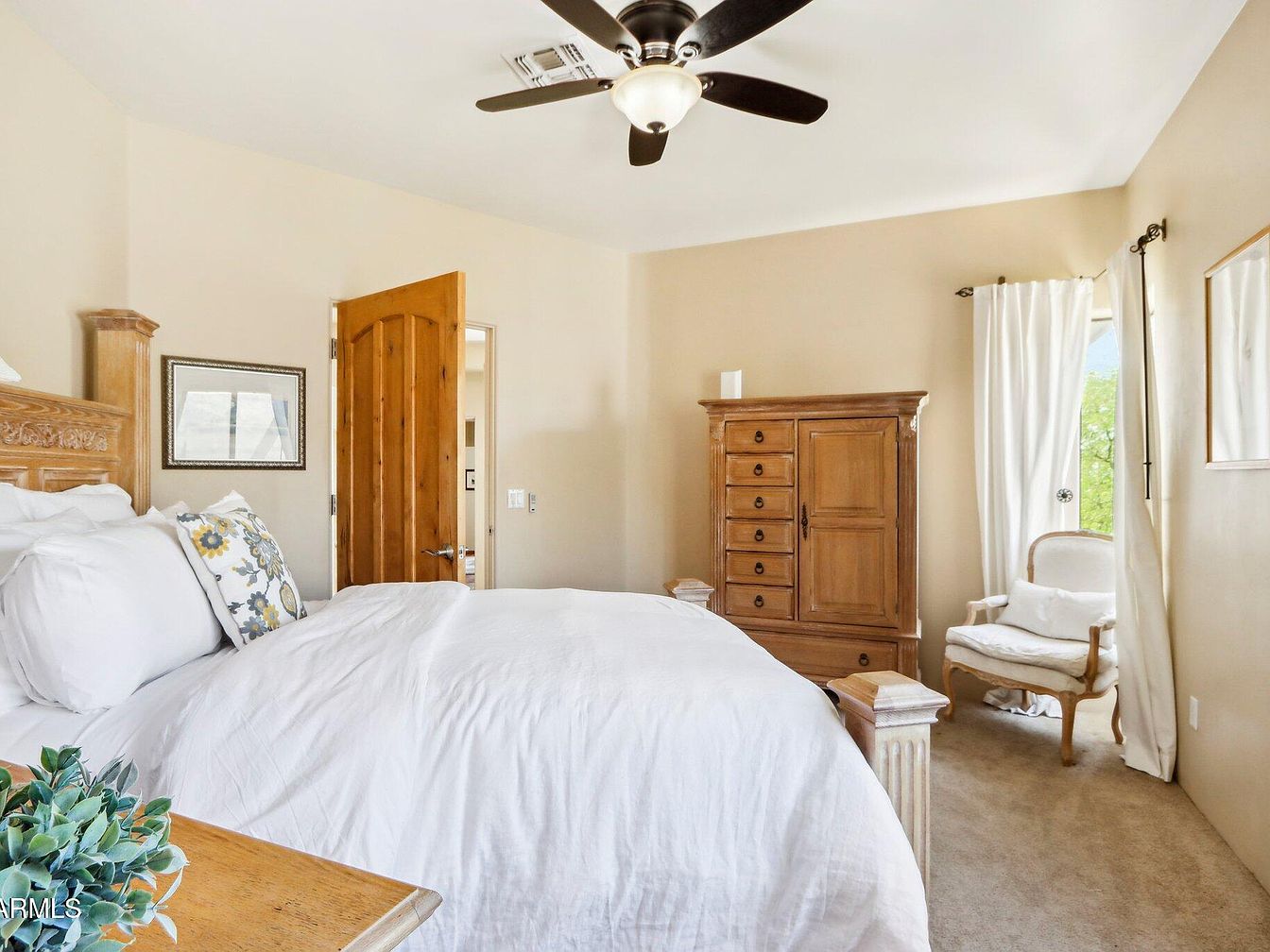 This bedroom is warm and inviting, featuring a large wooden bed frame with intricate carved details, paired with crisp white bedding that adds brightness and softness. The walls are painted a soothing beige, complementing the natural wood finishes of the door and tall dresser, which provides substantial storage. A comfortable upholstered chair next to a window draped in light, flowing white curtains invites relaxation and natural light. The ceiling fan with dark wooden blades blends functionality with style, enhancing the room’s airy atmosphere. Overall, the space conveys a blend of rustic charm and serene comfort.