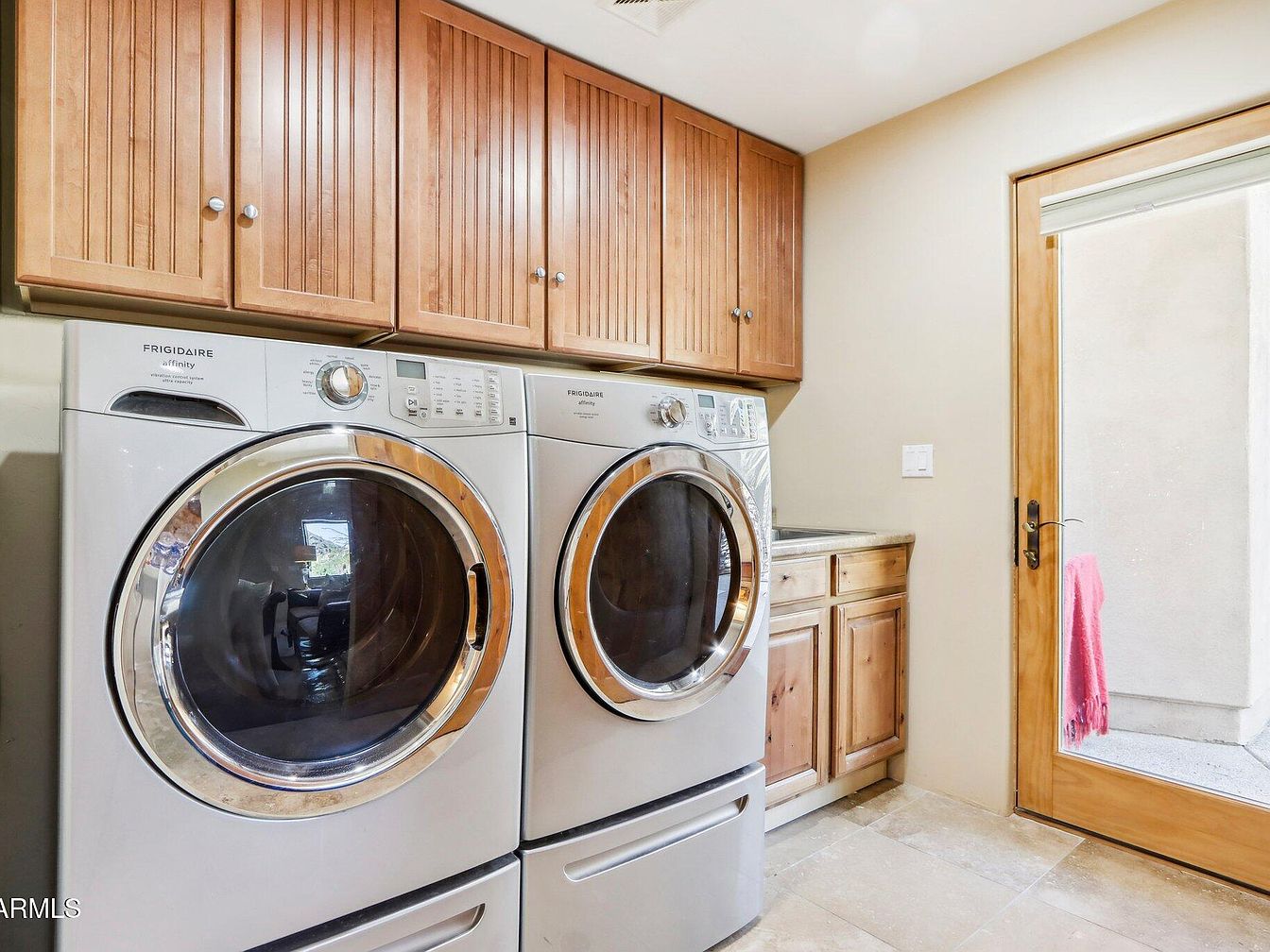 This laundry room features a practical layout with a side-by-side washer and dryer set in a modern white finish with chrome-accented circular doors. Above, warm wooden cabinets with vertical paneling provide ample storage space, complementing the similarly styled cabinetry below the countertop on the adjacent wall. The room’s color palette is neutral and inviting, with beige walls and light natural stone tile flooring that adds texture and warmth. A glass-paneled wooden door allows natural light to flood in, enhancing the brightness and airiness of the functional space designed for efficiency and ease of use.