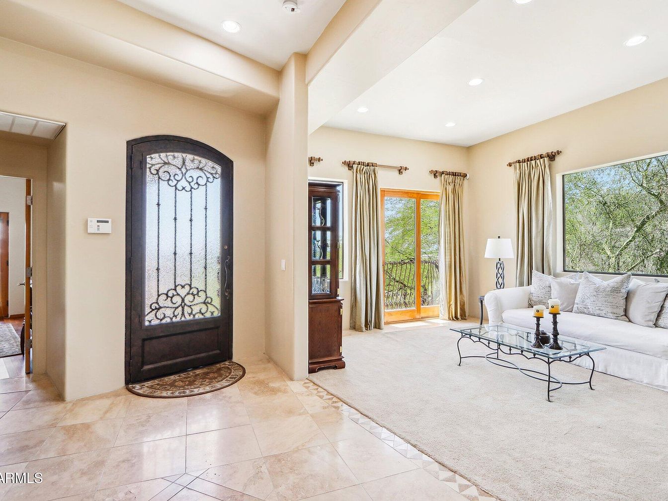 This space combines the home’s entrance and an inviting living area seamlessly. The dark wrought-iron front door with intricate scrollwork contrasts elegantly with the soft beige walls and polished marble floor tiles. Beyond the entrance, the living room boasts a relaxed, neutral palette with cream carpet and light beige walls that amplify natural light streaming through large windows and glass doors framed by gold-toned curtains. The seating area centers on a white sofa adorned with soft, neutral pillows, paired with a glass-top coffee table featuring wrought iron accents that echo the door’s design. A dark wooden cabinet and a decorative table lamp add warmth and texture, while the large windows frame serene views of lush greenery, enhancing the tranquil ambiance.