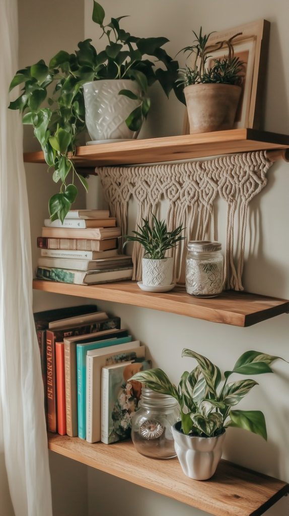 These boho wall shelves add a touch of modernity with hexagonal planters that hold vibrant green plants. The unique shape of the planters contrasts beautifully with the soft, natural tones of the surrounding decor. The shelves create a striking visual display that combines natural elements with contemporary design, making this an ideal setup for anyone looking to add a playful, modern twist to their boho-inspired space.