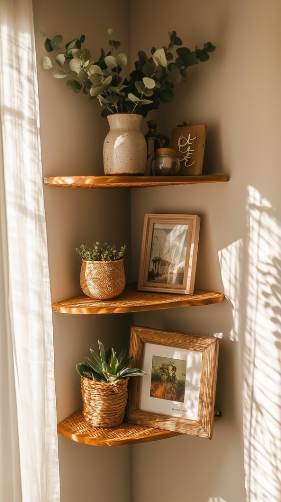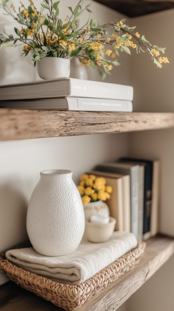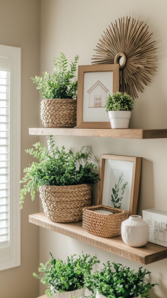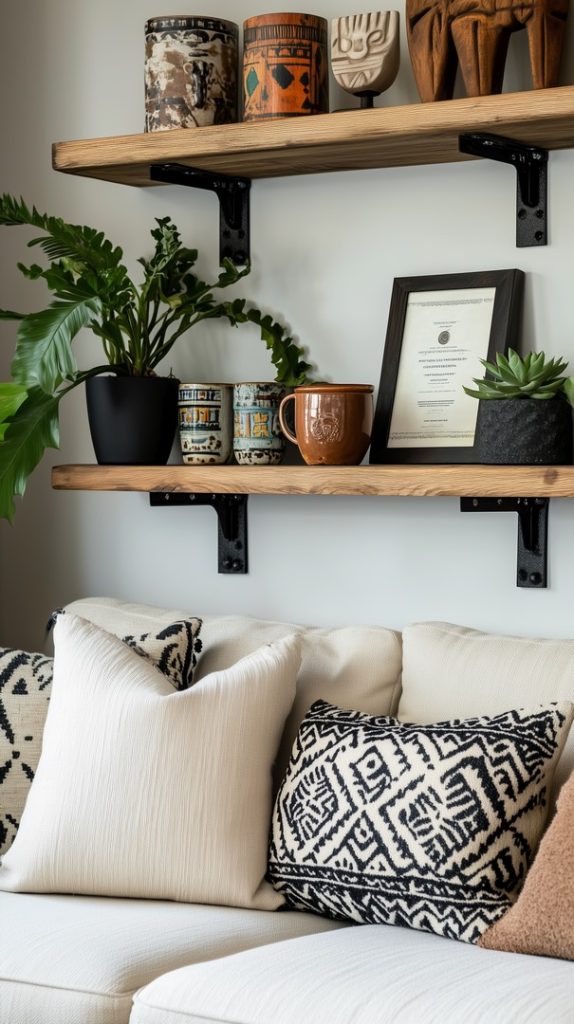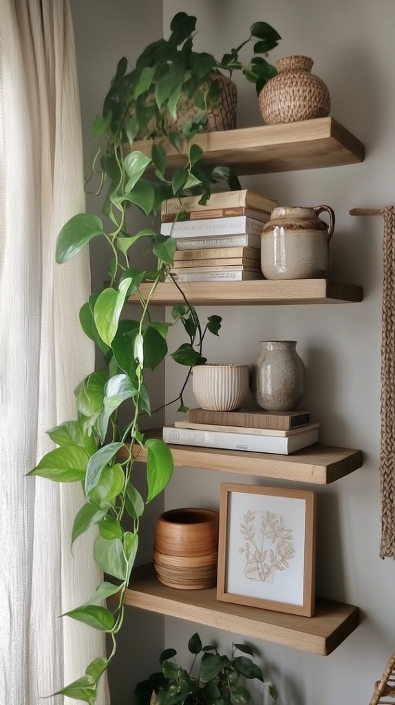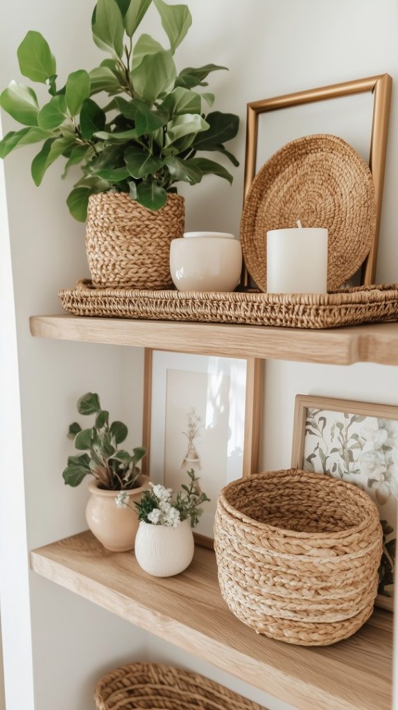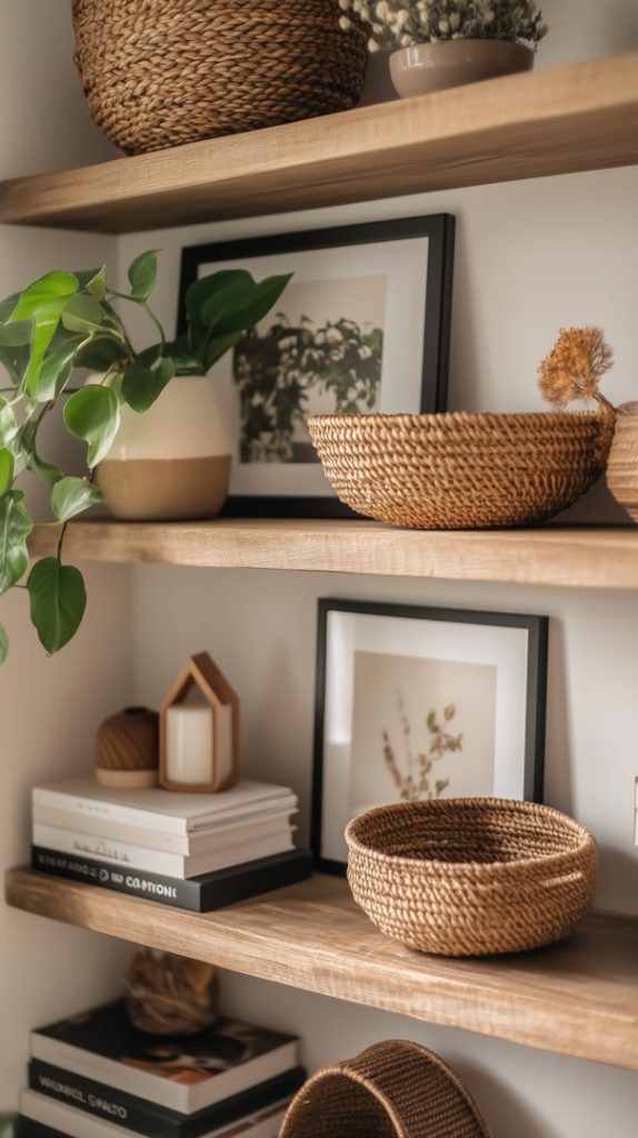This neutral boho shelf design is a masterclass in combining textures and tones. Soft beige throw pillows, earthy pottery, and woven baskets create a balanced, layered look. The natural materials add warmth to the space, while the green plant introduces a touch of vibrancy. This setup is perfect for cozy living rooms or bedrooms where a soft, inviting aesthetic is desired. The neutral color palette allows for easy customization and seasonal changes.