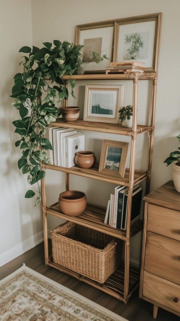 This earthy boho shelf embraces natural textures with its rattan shelving and terracotta planters, creating a serene and calming vibe. The cascading green plant adds a lively touch, while framed artwork and neutral-toned books complete the organic, bohemian look. The wicker basket at the bottom adds both storage and texture, making this setup ideal for a living room or bedroom. The balance of soft wood tones and greenery makes this shelf a perfect addition for those seeking a relaxed, nature-inspired boho aesthetic.