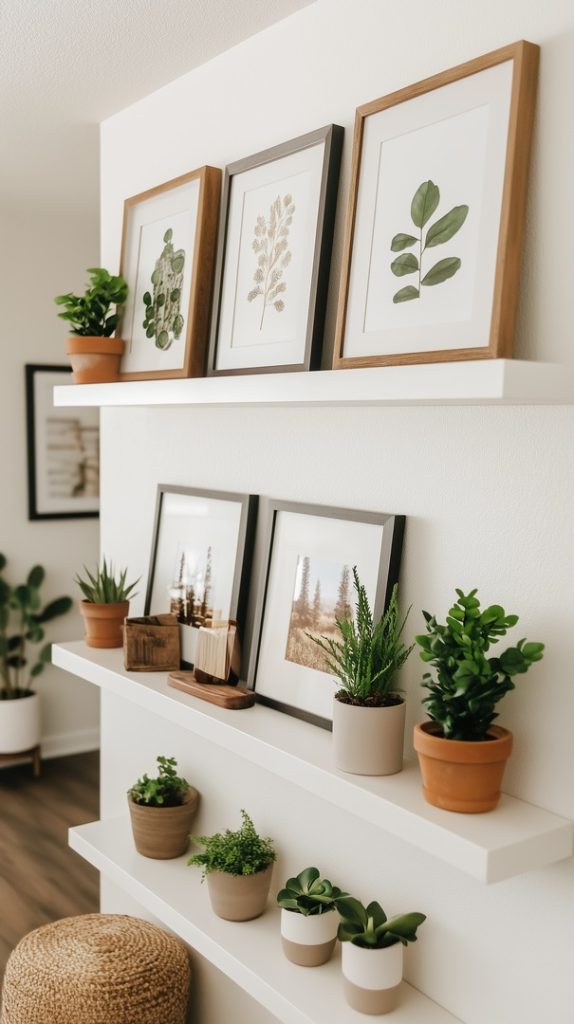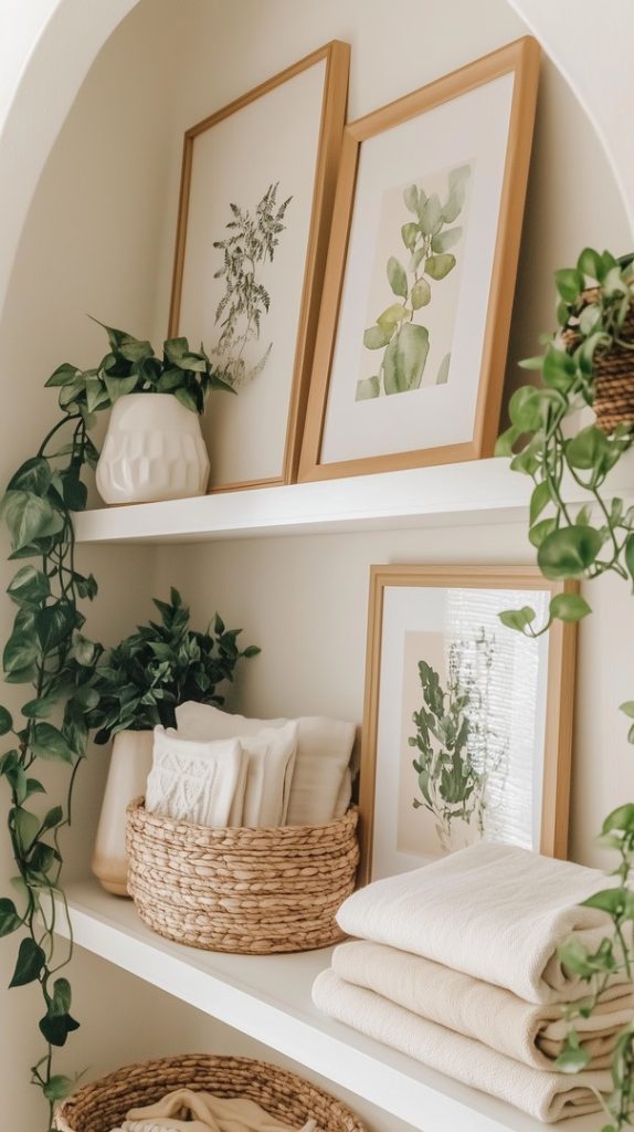 This boho-inspired shelf brings a refreshing blend of nature and art to any space. The crisp white shelves provide a clean backdrop for earthy accents, including terracotta pots, neutral planters, and vibrant greenery. Framed botanical prints add an artistic touch, drawing attention to the natural theme of the display. Each plant, from succulents to leafy greens, adds texture and life to the minimalist setting, while the soft palette of wood, beige, and green fosters a serene environment. It’s perfect for creating a fresh and inviting atmosphere in living or workspace areas.