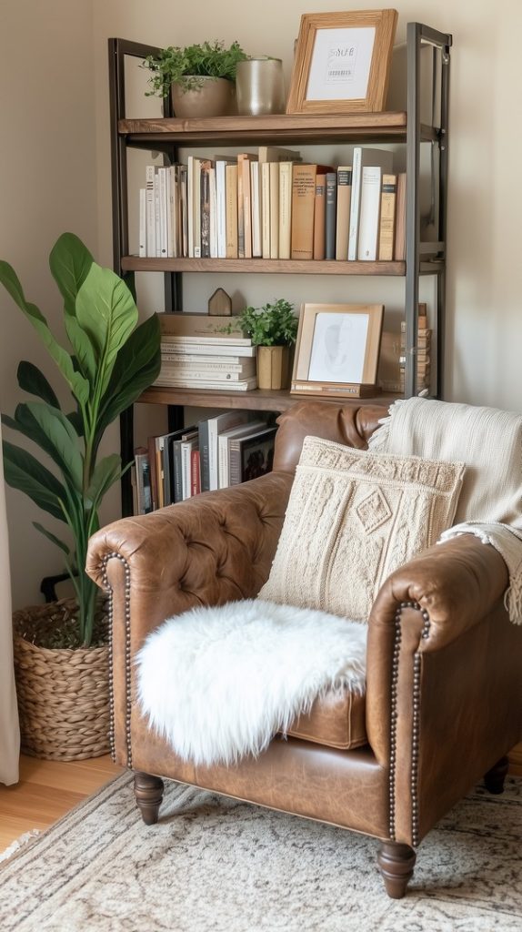 This cozy reading nook pairs perfectly with a boho-inspired shelf for a relaxed and stylish vibe. The brown leather armchair, draped with a textured knit pillow and a soft fur throw, invites you to settle in with a good book. The shelf features natural wood and metal accents, creating an earthy, industrial feel. It’s adorned with a variety of neutral-hued books, minimalist artwork, and vibrant green plants, making this the ideal space for literature lovers who appreciate a calm, bohemian aesthetic.