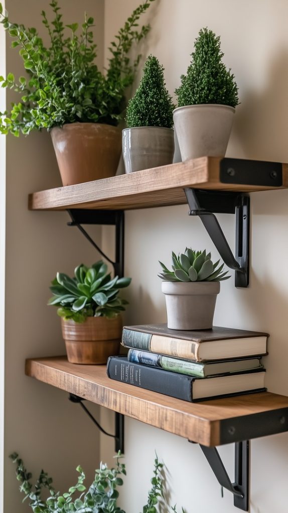 This beautiful shelf setup is a perfect blend of natural elements and earthy tones, offering a minimalist yet elegant boho aesthetic. The live-edge wooden shelves add an organic feel, while the dark pottery vases and potted plants infuse richness and texture. The carefully placed books balance the earthy décor, adding height and structure. With the large leafy plants in rustic pots, this arrangement creates a sense of calm, natural beauty, perfect for bringing warmth and nature indoors. It’s an ideal choice for those who love blending simplicity with natural elegance.