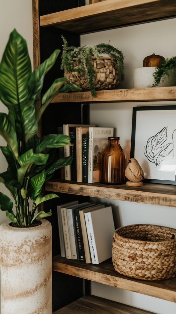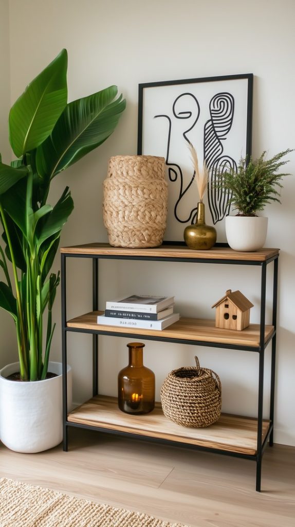 This shelf styling is a beautiful mix of organic elements and simplicity. The large leafy plant paired with natural wood and pottery brings an earthy touch to the space. The light wooden shelf provides a neutral backdrop, allowing the greenery to shine as the focal point. Perfect for a living room or entryway, this setup is ideal for those who want to create a calm, nature-inspired boho space without too much clutter.