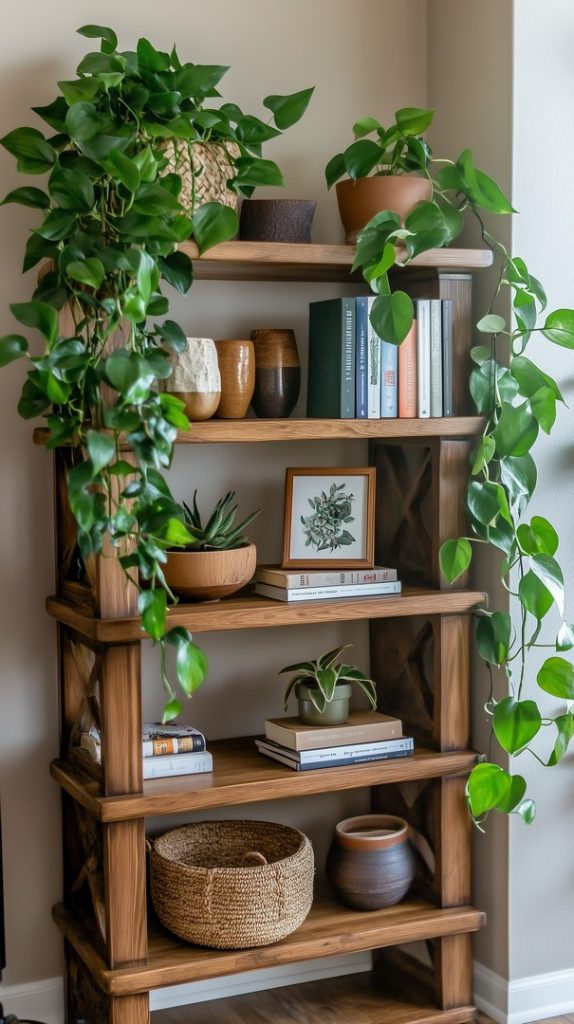 This boho bookshelf combines soft textiles, vibrant greenery, and rustic wooden shelving for a cozy, inviting look. The potted plants bring life to the space, while the framed artwork adds a personal touch. The combination of textures and natural elements makes this shelf ideal for a living room or bedroom that needs a touch of warmth and bohemian charm. Perfect for those who love to mix nature and decor to create a serene, laid-back environment.