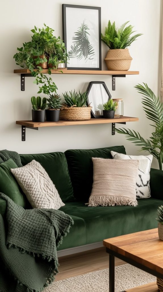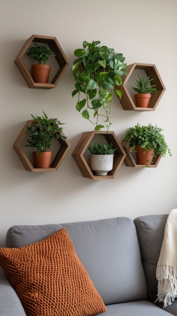 This eye-catching boho shelf display uses hexagonal wooden shelves to house a variety of lush green plants. The natural wood tones paired with terracotta pots create a grounded, organic feel that complements the minimalist, modern living room decor. The vibrant greenery breathes life into the space, while the geometric shapes add a contemporary twist to the boho aesthetic. The cozy gray couch and textured orange throw pillow complete the inviting atmosphere, making this the perfect setup for plant lovers who appreciate a stylish, bohemian flair in their home decor.