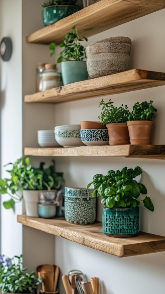 This cozy boho kitchen shelf setup features wooden floating shelves adorned with a collection of eclectic ceramic pots, terracotta planters, and lush green herbs. The mix of textures and earthy tones in the ceramics adds a handmade, artisanal feel, while the fresh herbs such as basil and thyme bring a vibrant touch of nature indoors. The rustic wood shelves complement the overall natural aesthetic, creating a functional yet stylish kitchen space. This arrangement is perfect for anyone who enjoys cooking with fresh herbs and appreciates a laid-back, bohemian vibe.