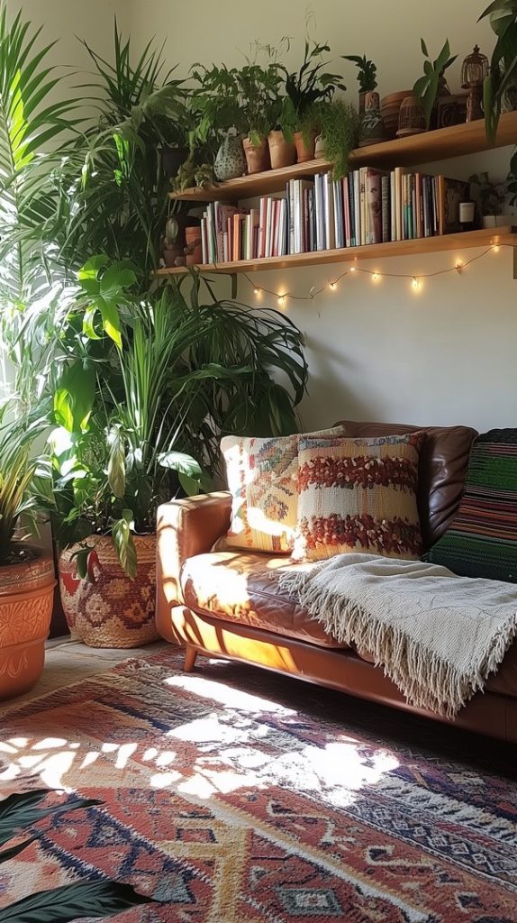 This layered boho shelf showcases an eclectic mix of books, plants, and small decorative items, creating a lively and inviting space. The natural wood tones of the shelf and the leafy green plants create a warm, organic atmosphere that is both functional and stylish. The addition of cozy cushions and soft textiles enhances the bohemian aesthetic, making this setup perfect for a reading corner or living room that needs a personal, lived-in touch.