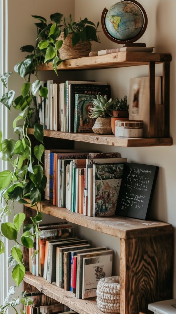 This layered boho shelf features a mix of books, potted plants, and woven baskets, making it both visually appealing and practical. The varying shelf heights allow for interesting displays, while the natural wood tones and soft greenery create a harmonious, lived-in look. Ideal for book lovers who want to incorporate boho decor into their reading nook, this setup provides the perfect balance between functionality and style.