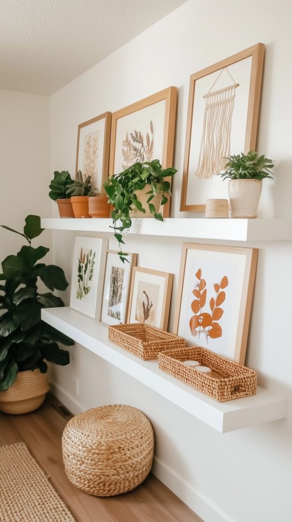 This boho shelf setup embraces simplicity with a focus on neutral tones and organic textures. Woven baskets, small potted plants, and framed artwork bring a subtle bohemian flair to the space without feeling overly decorated. The light wood shelving and soft greenery create a calming environment, perfect for a cozy reading nook or an entryway that needs a touch of warmth. This design is ideal for those who prefer a minimalistic approach to boho decor with earthy, natural elements.