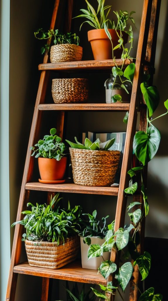 This boho ladder shelf offers a unique and stylish way to display potted plants and decor. The open shelving provides ample space for a variety of greenery, while the natural wood frame adds warmth to the overall look. This design is perfect for plant lovers who want to incorporate a boho aesthetic into their home without sacrificing functionality. The layered shelves allow for a playful and dynamic display, ideal for any room that needs a touch of greenery.