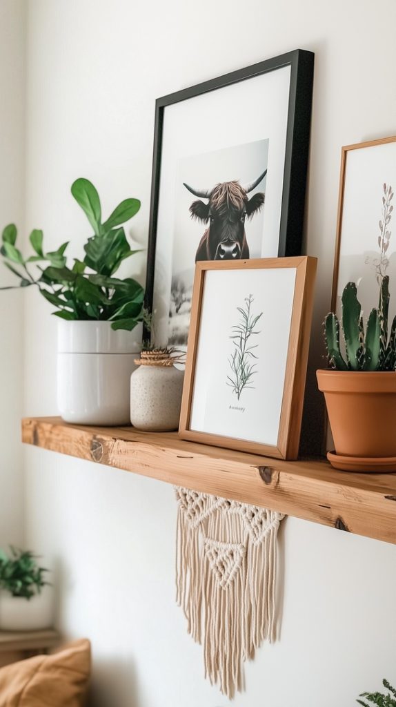 This boho-inspired floating shelf offers a perfect balance of earthy and artistic elements. The shelf displays a vibrant mix of potted greenery, including leafy houseplants and cacti, giving the space a touch of nature. Complementing the plants, framed botanical prints and a striking portrait of a Highland cow add an artful, personal touch. A macramé hanging beneath the wooden shelf enhances the bohemian aesthetic, while the mix of natural textures and minimalist art creates a calming and stylish focal point in any room.