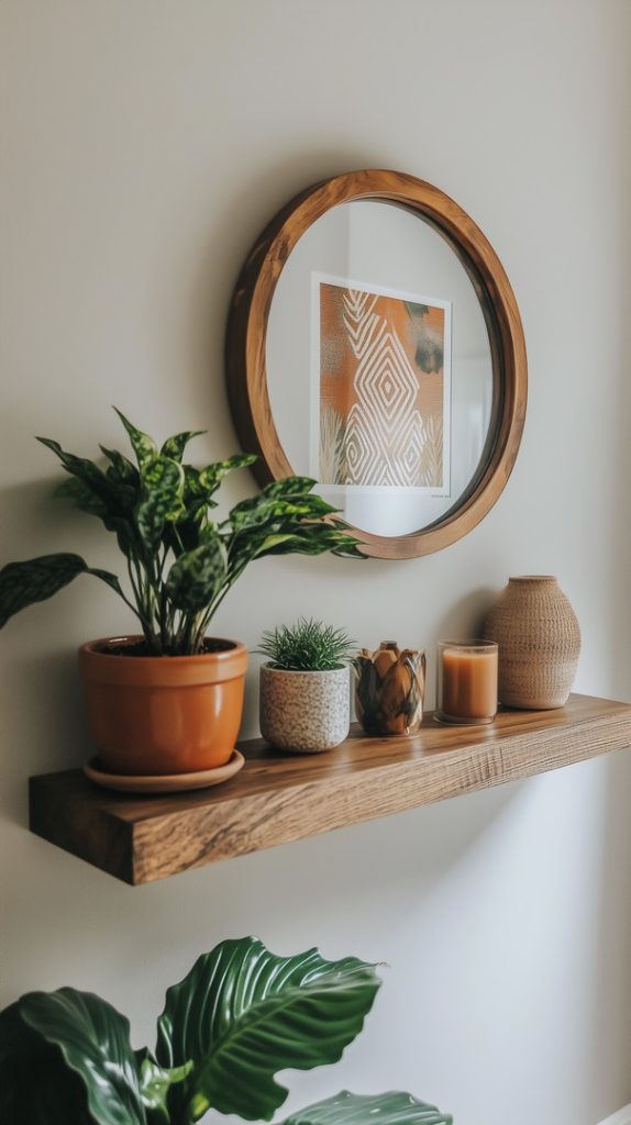 This minimalist boho shelf design features a perfect blend of organic textures and modern simplicity. The floating wooden shelf is topped with a natural terracotta potted plant, a textured small planter, and a warm-toned candle, adding both greenery and warmth to the space. A round wooden-framed mirror above the shelf reflects light and enhances the earthy aesthetic. The combination of natural textures, geometric shapes, and neutral tones gives this vignette a cozy, inviting feel, making it a beautiful focal point for a hallway or small nook.