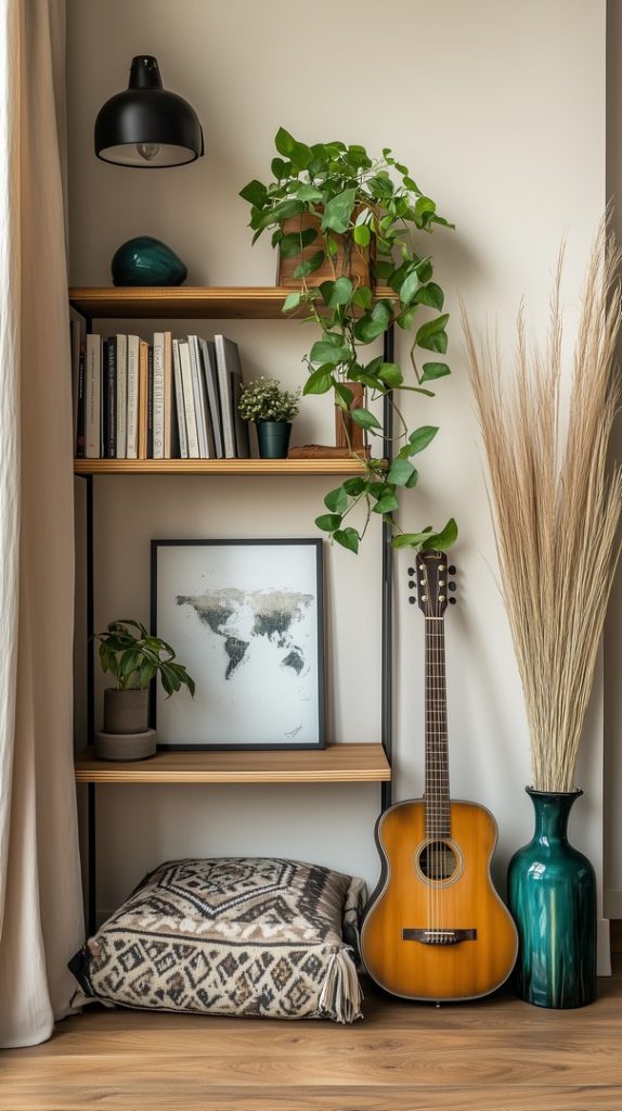 This boho shelf incorporates an eclectic mix of decor, including a cozy cushion, potted plants, and even a guitar, making it both functional and stylish. The open shelving keeps the space light, while the natural elements and neutral tones create a warm, inviting atmosphere. This shelf is perfect for musicians or creatives who want to combine their love for boho style with their passion for music in a relaxed yet curated way.