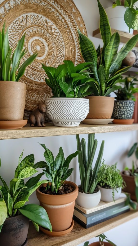 This boho shelf arrangement features a collection of terracotta planters filled with lush greenery, creating a vibrant and earthy display. The natural tones of the planters contrast beautifully with the soft wood shelves, while the potted plants add life and color to the space. This setup is perfect for anyone looking to bring a bit of the outdoors into their home with a simple, nature-inspired boho design that is both practical and stylish.