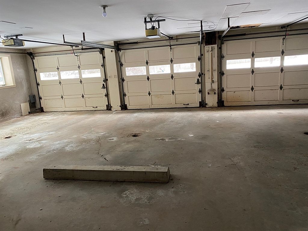Spacious three-car garage with off-white paneled doors featuring horizontal windows that allow natural light inside. The concrete floor shows signs of wear, with visible stains, discoloration, and cracks, emphasizing its utilitarian nature. A single concrete parking stop sits on the floor near the foreground. Overhead, exposed garage door mechanisms and tracks run across the ceiling, which is painted white but shows signs of patchwork and minor water damage. One wall has a small rectangular window, bringing in additional daylight. The space feels functional, minimal, and slightly aged, with a focus on practicality rather than ornamentation.