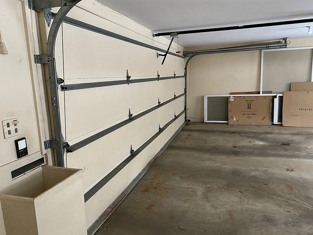 A two-car garage space with a concrete floor showing some light stains and scattered debris. The garage door is closed and features metal braces and hinges. On the left wall, there is a control panel for the garage door opener and a tall, open storage box mounted below it. The walls are painted off-white, giving a neutral, utilitarian feel. At the back, several large cardboard boxes and window frames lean against the wall, indicating storage use. The overall atmosphere is functional and practical, typical of a residential garage with minimal decoration.