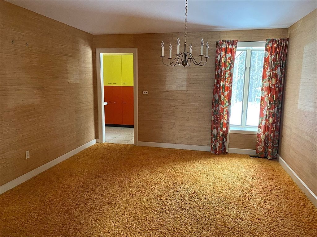 A modestly sized dining room featuring warm beige grasscloth wallpaper on all walls and plush golden-brown carpet underfoot. A single rectangular window on the right wall is dressed with heavy floral patterned curtains in red, green, and white, bringing a touch of color to the neutral palette. In the center of the ceiling hangs an elegant, vintage brass chandelier with candle-shaped bulbs. The room leads through an open doorway to a kitchen visible beyond, distinguished by its bold yellow upper cabinets and orange lower cabinets, while the window provides ample daylight and a view outside to snowy woods.