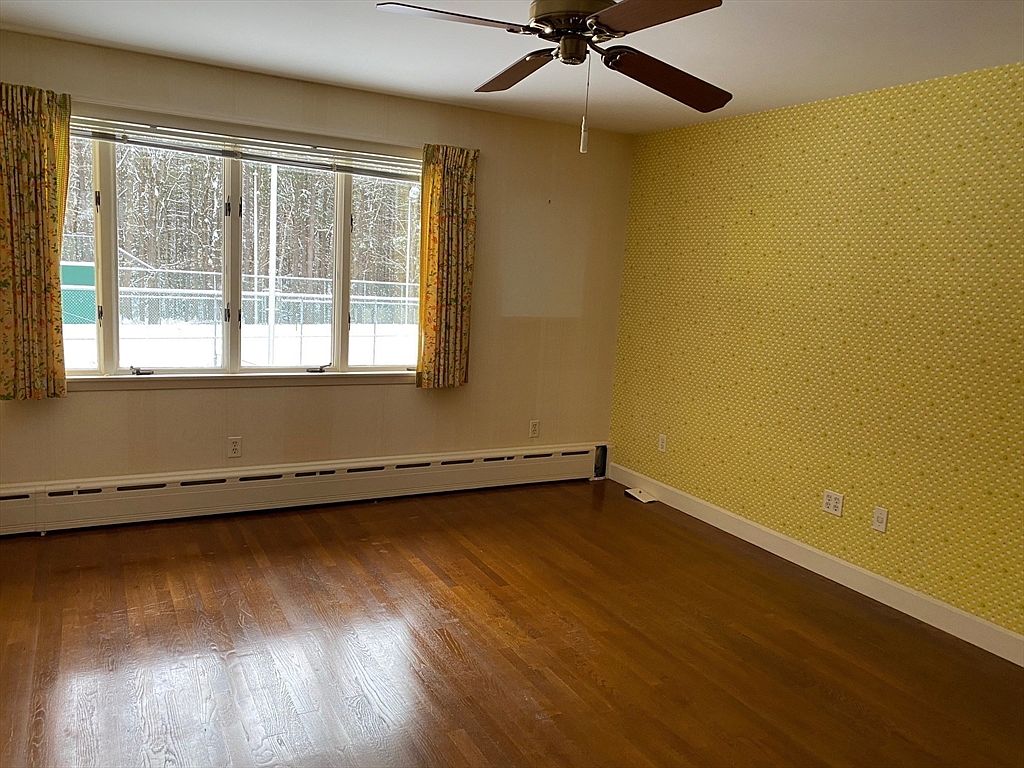 This space features a large window with divided panes, framed by yellow curtains decorated with a subtle floral pattern. The wall to the right is covered in textured yellow wallpaper with a classic geometric dotted design, while the remaining walls are neutral and understated. A central ceiling fan with wooden blades hangs overhead, providing both visual interest and functionality. The wooden floor shows a warm, natural finish, contributing to the room’s inviting atmosphere. Radiator heating runs beneath the windows, and white baseboards line the perimeter, adding a sense of clean definition to this bright and airy room.
