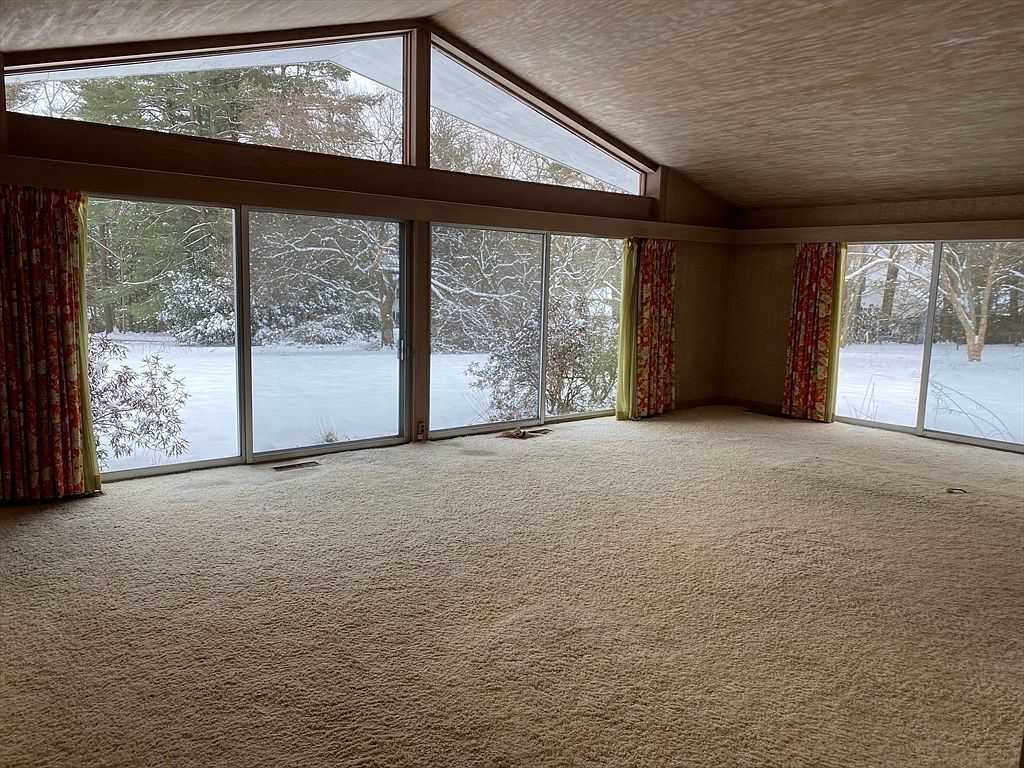 A spacious room with a dramatic sloped ceiling and wall-to-wall beige carpeting, bordered on two sides by expansive floor-to-ceiling glass windows and sliding doors. The windows, framed in wood, give an unbroken view of a snowy landscape dotted with trees outside, flooding the room with natural light. Vintage patterned curtains in red, pink, and yellow hang at the windows’ edges, introduced as cheerful accents against the otherwise neutral color scheme. Clean lines, abundant natural light, and unadorned surfaces create a midcentury modern feel, emphasizing the home’s connection to the outdoors and a serene, inviting atmosphere.