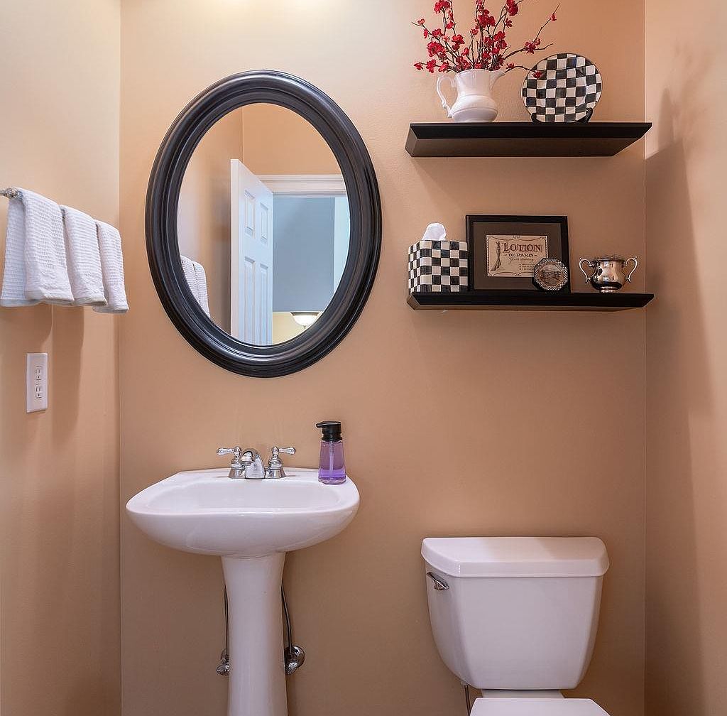 This compact guest bathroom features warm beige walls contrasted by white sanitary fixtures, including a pedestal sink and a classic toilet. Centered above the sink hangs an elegant black oval mirror, adding depth and sophistication to the space. Two dark floating shelves adorn the wall, decorated with a mix of vintage-style items such as a framed print, a silver trophy cup, and checkerboard-patterned accessories in black and white, creating a playful yet refined look. A neatly folded white towel is mounted on a towel bar beside the sink, while a lavender soap dispenser adds a subtle pop of color.