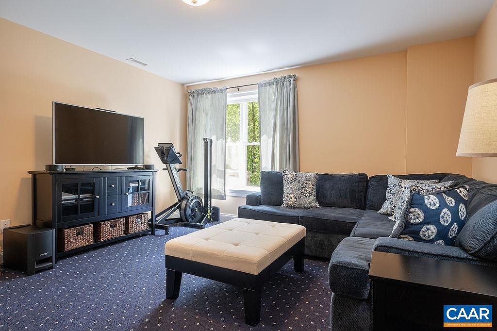 This cozy family room features a soft beige wall color creating a warm and inviting atmosphere. The spacious L-shaped dark gray sectional sofa is adorned with an assortment of patterned blue and white throw pillows, adding texture and a pop of color. A large, light ottoman serves as a central coffee table, balancing the room’s darker elements. Opposite the seating is a black media console with woven baskets and glass doors, topped by a flat-screen TV, providing entertainment. Natural light filters through sheer curtains framing a large window, and an exercise bike near the window suggests versatility in room use. The blue carpet with small white accents complements the sofa, tying the color scheme together.