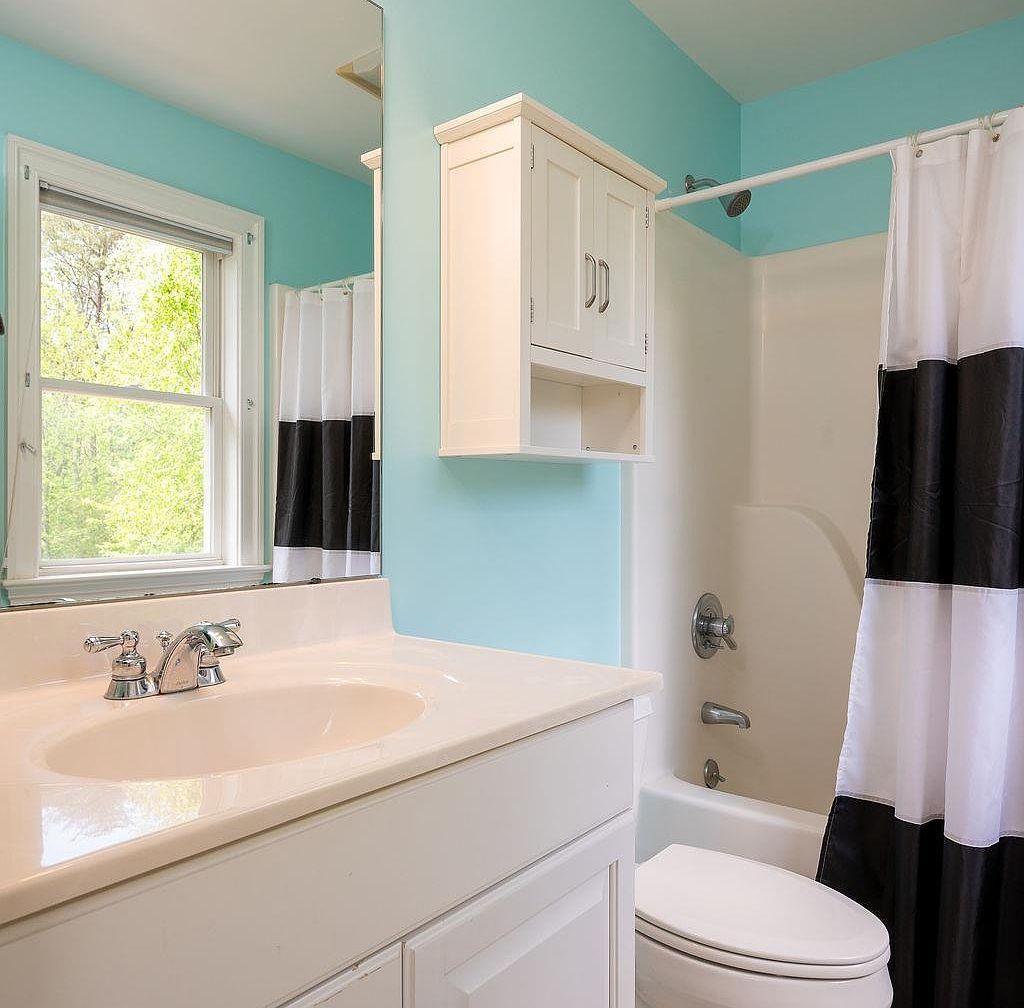 This bathroom features a refreshing and light blue wall color that contrasts nicely with the white cabinetry and fixtures. The vanity has a smooth, creamy countertop with a built-in oval sink and chrome faucet, lending a clean modern feel. Above the toilet, there is a white wall-mounted cabinet offering extra storage with both closed and open compartments. The bathtub and shower area is accented with a black and white striped shower curtain, adding a bold graphic element. A large window fills the space with natural light, highlighting the bright, airy atmosphere of the room.