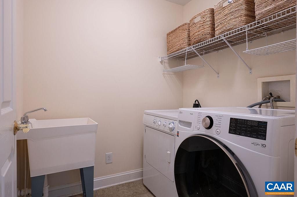 This compact laundry room features a side-by-side washer and dryer set with a sleek, modern design. The walls are painted a soft, neutral beige, providing a clean and calming atmosphere. A white utility sink with metal legs sits in the corner, adding a practical element for hand-washing clothes or other cleaning tasks. Above the appliances, open wire shelving holds several woven wicker baskets, combining functional storage with rustic charm. The room’s simple layout maximizes space efficiency, while the baseboard trim adds a subtle architectural detail that complements the understated, practical aesthetic.