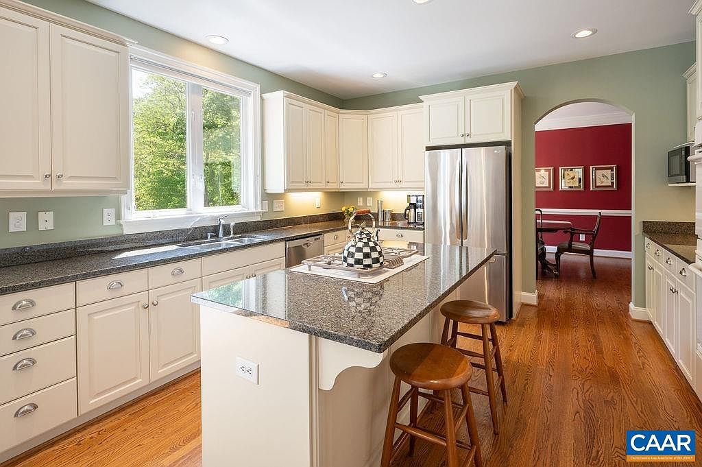 This bright kitchen features an efficient L-shaped layout with ample cabinetry finished in a soft cream hue that contrasts nicely with the grey granite countertops. The large kitchen island serves as a functional centerpiece, topped with the same polished granite and equipped with a stovetop. Two wooden bar stools provide casual seating, inviting conversation and relaxed meal prep. Natural light pours through the sizable window above the sink, highlighting the warm honey-toned hardwood flooring. Stainless steel appliances, including a double-door refrigerator, add a modern touch, while the gentle sage wall color creates a comforting backdrop. An arched doorway leads to a bold red dining room, adding vibrant depth to the space.