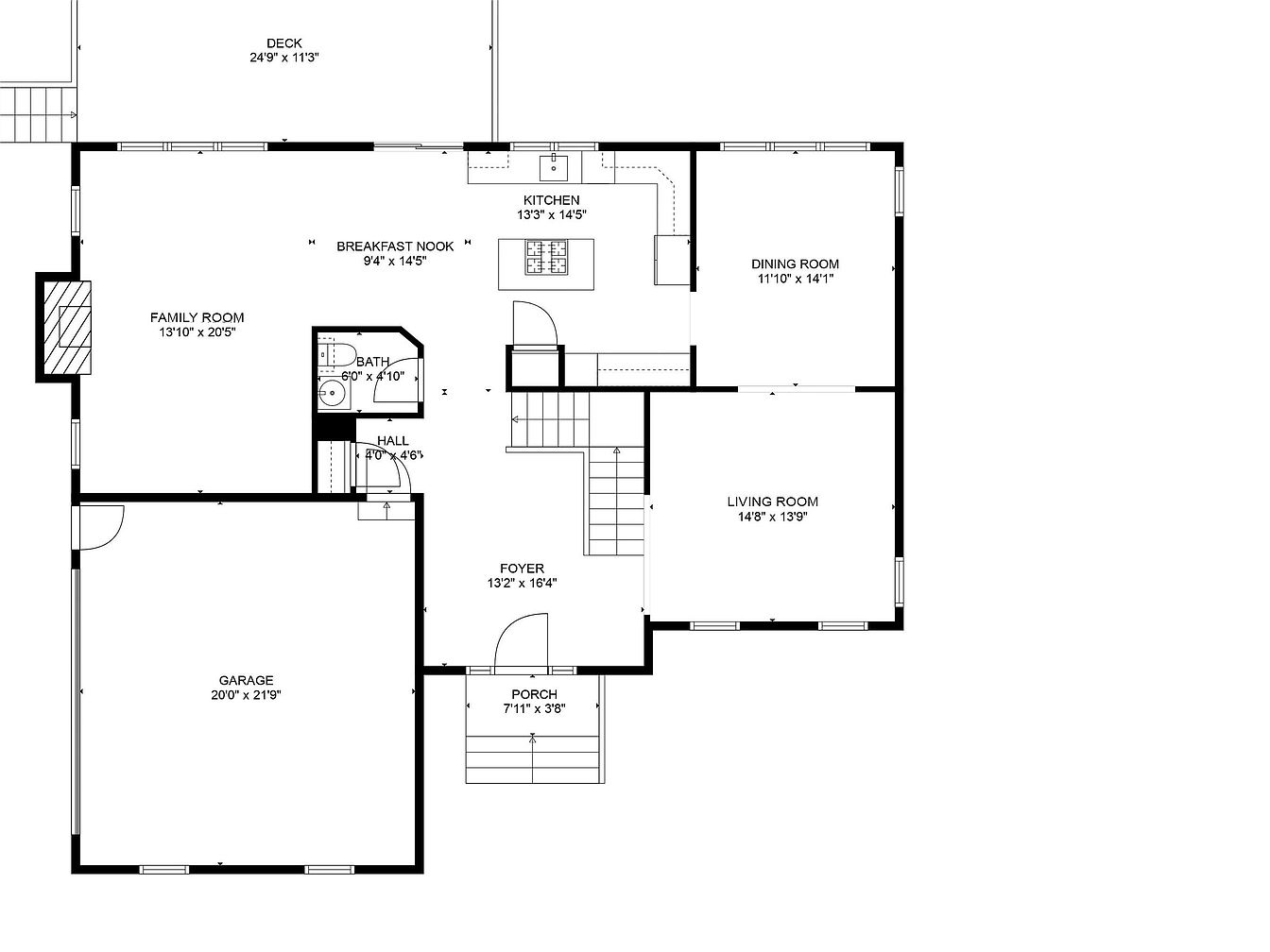 This floor plan reveals a well-organized main level designed for both functionality and comfort. Enter through a porch leading into a spacious foyer measuring 13’2″ by 16’4″, serving as central access to the living room, kitchen, and staircase. To the right is a formal living room adjacent to the dining room, allowing for elegant entertaining. The kitchen and breakfast nook form an open, flowing area at the rear, with access to a large deck. The family room is on the left side, emphasizing casual relaxation. A convenient small bathroom and garage complete this thoughtful layout.