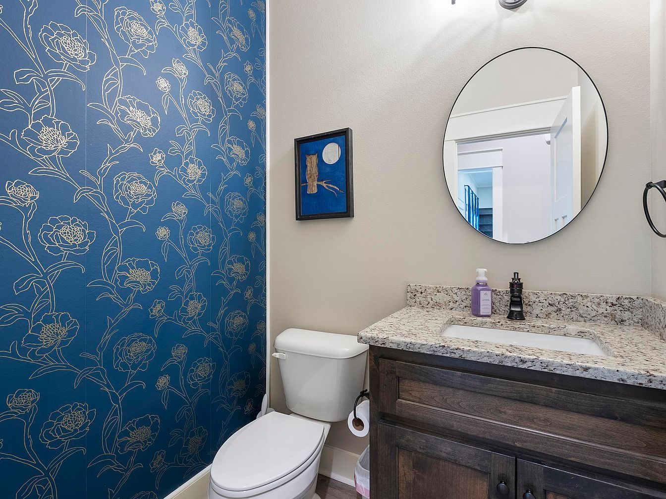 This compact powder bathroom features a striking accent wall with navy blue wallpaper adorned with delicate white floral line art, creating a bold yet elegant focal point. The opposite walls are painted a soft neutral tone, offering balance and warmth. A sleek granite countertop with subtle speckling tops a dark wood vanity, adding rustic charm and sophistication. Above, a large round mirror with a thin black frame reflects light and opens up the space. The black faucet and hardware complement the vanity’s finish, while minimalistic fixtures maintain a clean, contemporary feel.