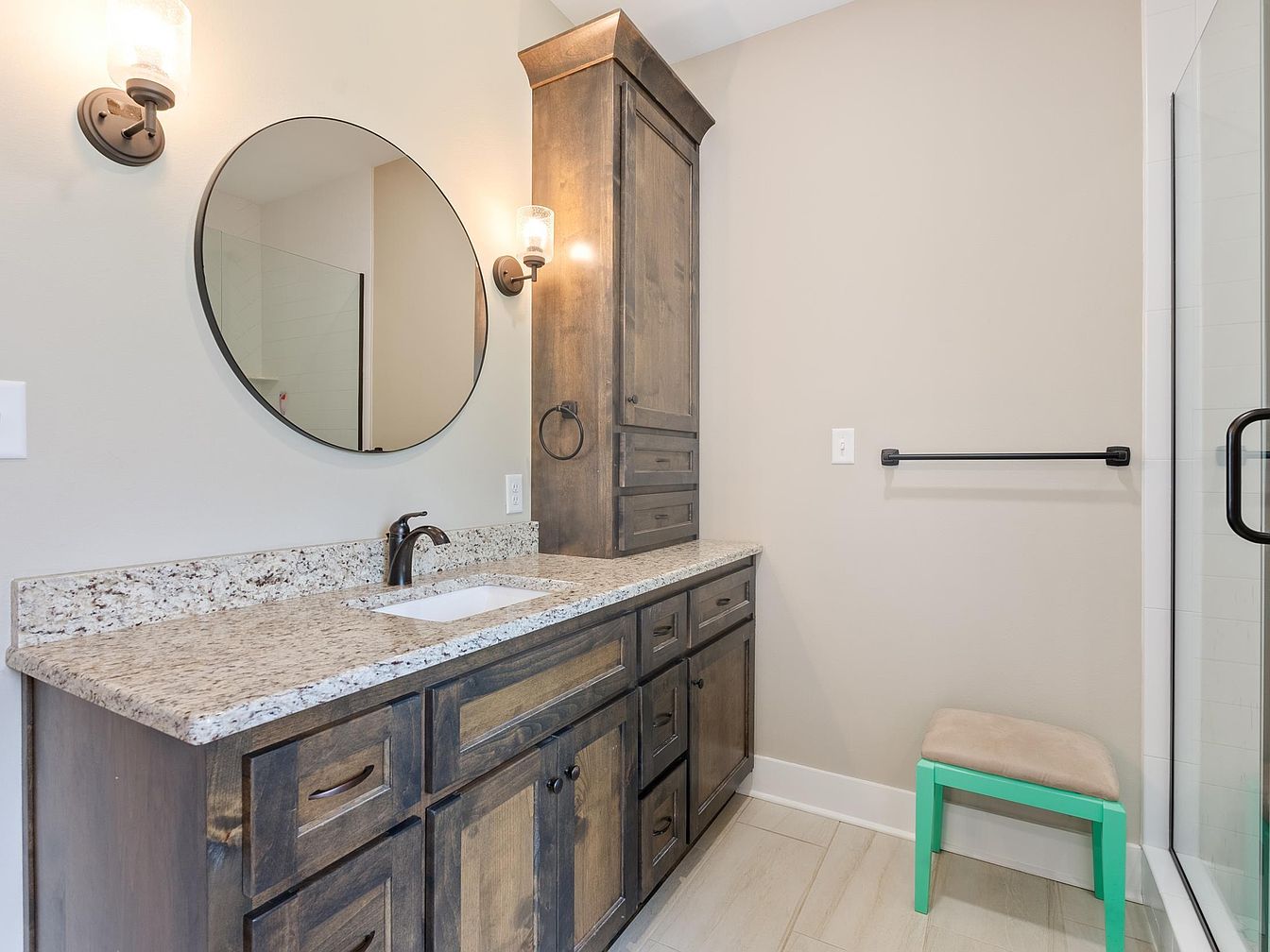 This bathroom corner features a spacious vanity with a granite countertop in light tones accented by darker speckles. The cabinetry is crafted from warm, medium-toned wood with a matte finish, providing ample storage with multiple drawers and doors. A large, round mirror with a thin black frame hangs above an undermount sink paired with an oil-rubbed bronze faucet. Matching wall sconces with frosted glass shades flank the mirror, offering balanced, ambient lighting. Adjacent to the vanity is a tall cabinet that adds vertical storage. The neutral beige wall paint complements the light wood-look tile flooring. A small stool with turquoise legs and a beige cushion sits beneath a simple black towel bar, adding a subtle pop of color to the clean, modern design.