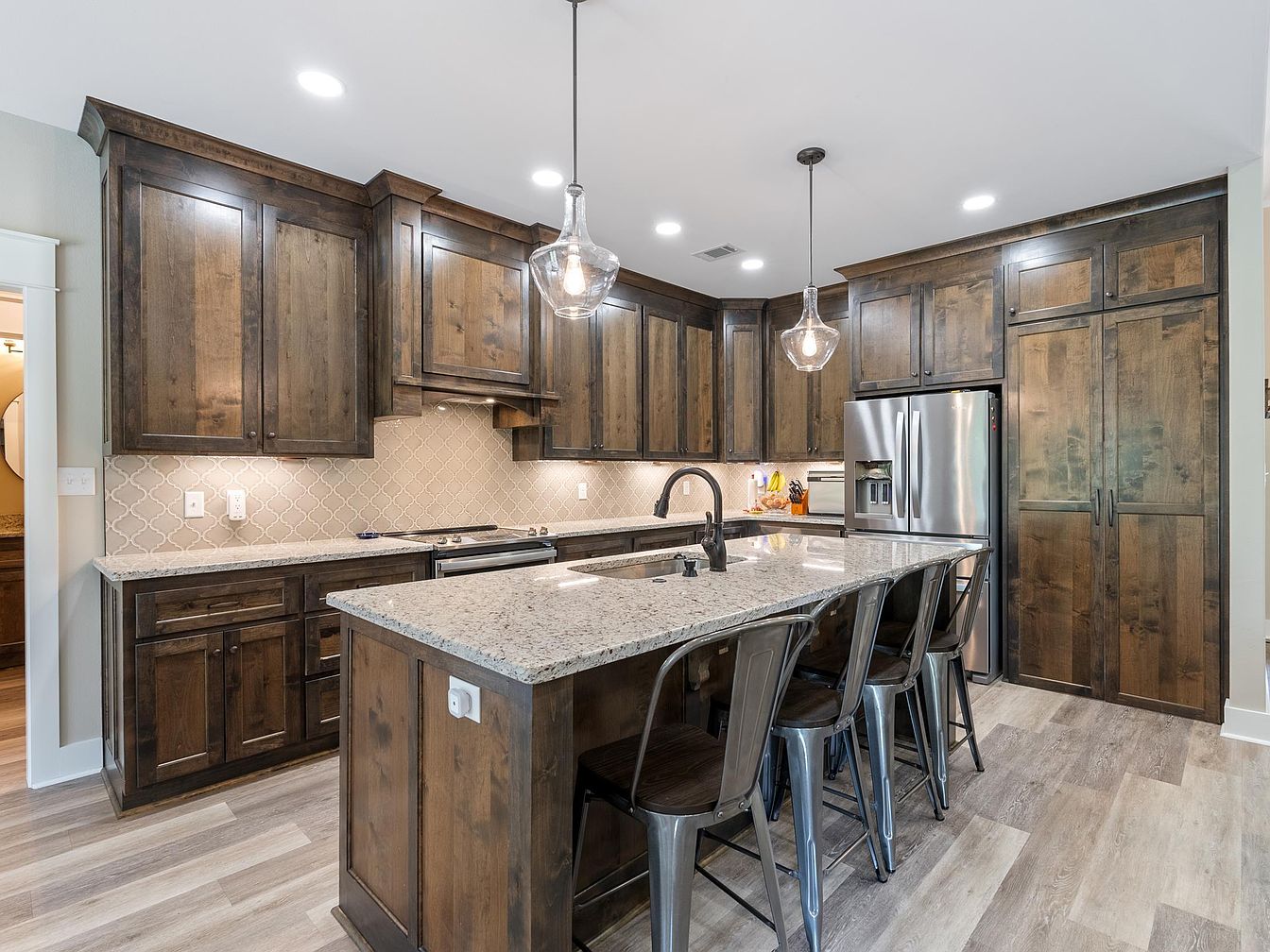 This kitchen highlights a spacious central island with a speckled granite countertop that contrasts beautifully with the rich, dark wood cabinetry surrounding the space. The cabinetry features recessed panel doors and elegant crown molding, adding a classic yet rustic charm. Soft under-cabinet lighting illuminates a beige tiled backsplash with subtle geometric patterns, enhancing the warm, earthy tones. A stainless steel refrigerator blends modern convenience with traditional wood elements. Three industrial-style metal bar stools with dark wooden seats line the island, while clear glass pendant lights hang overhead, providing an inviting ambiance. The neutral-toned floor complements the overall natural palette.