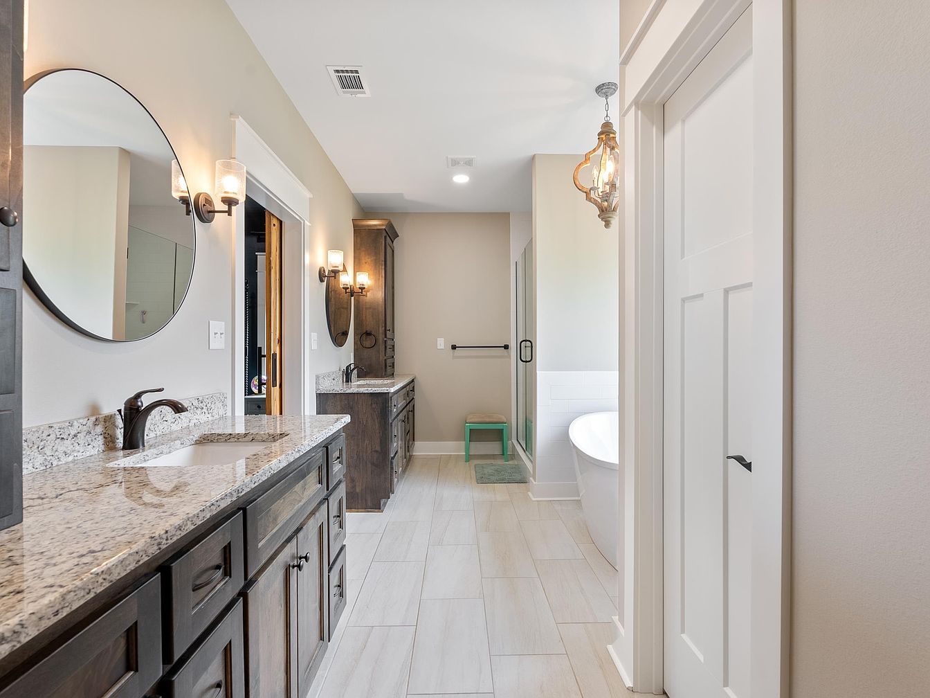This spacious bathroom features a long, dual vanity with dark wooden cabinetry and granite countertops. Two large round mirrors with black frames are mounted above each sink, complemented by modern wall sconces with glass shades. Light neutral walls and light wood-look floor tiles add warmth and brightness to the space. Toward the back, a freestanding white soaking tub sits adjacent to a glass-enclosed shower. The blend of rustic dark wood with sleek white and beige tones creates a balanced, contemporary yet cozy atmosphere. A pendant light with a decorative wooden frame adds subtle charm near the tub area.