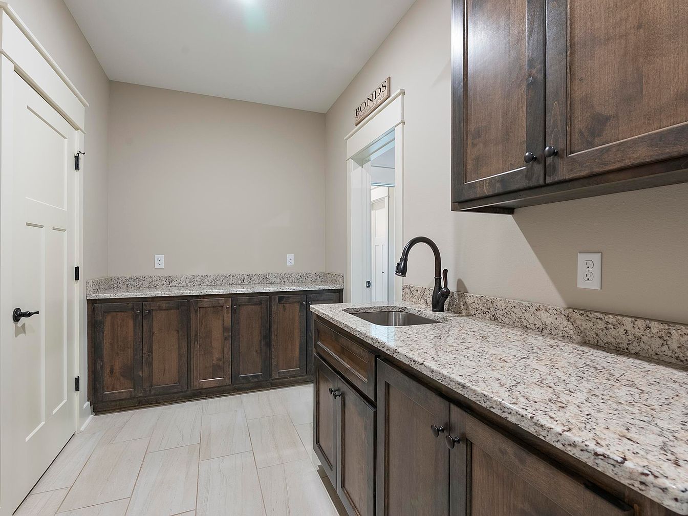 This utility space features ample granite countertops with a speckled pattern in neutral tones that complement the beige walls and light wood-look tile flooring. Dark stained wood cabinets with a matte finish provide a rich contrast while offering abundant storage both below and above the counters. A sleek black faucet over a stainless steel sink adds a modern touch. The layout maximizes workspace with a long counter on one wall and an additional counter opposite the door, making the room practical and visually balanced. Minimalist trim and neutral tones create a calm, functional atmosphere.