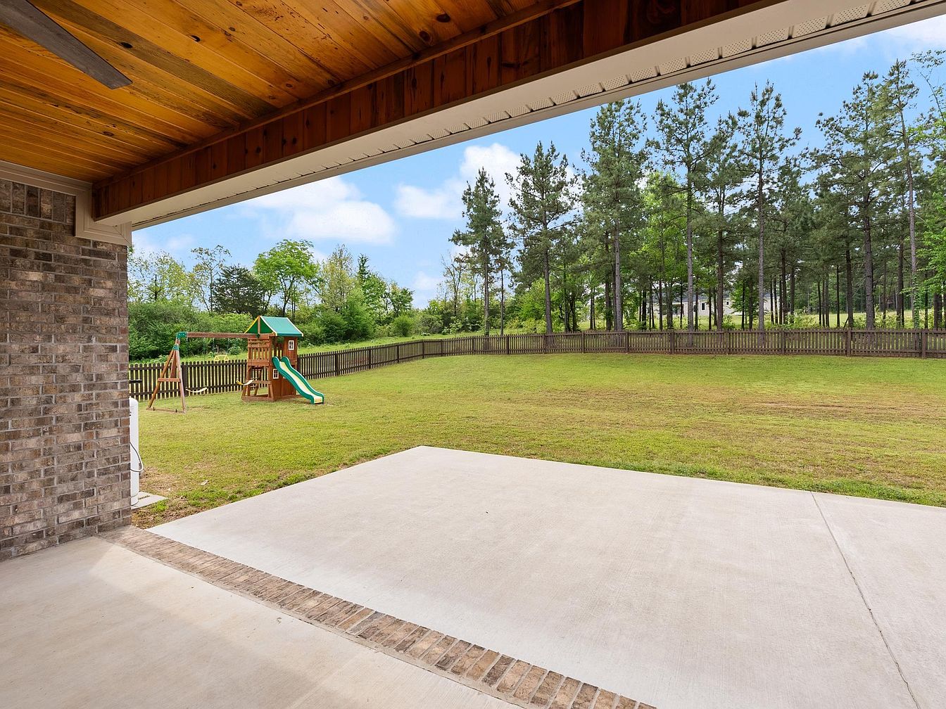 This covered backyard patio features a warm wooden ceiling with a ceiling fan, contrasting with the gray brick exterior wall and light concrete floor accented by a subtle brick inlay. The open layout extends to a spacious green lawn enclosed by a wooden picket fence, offering a safe play area. A compact wooden playset with a green slide and swings adds a child-friendly touch. Tall evergreen trees in the background provide privacy and natural beauty, blending nature with comfort. This outdoor space invites relaxation and family fun in a secluded, peaceful setting.