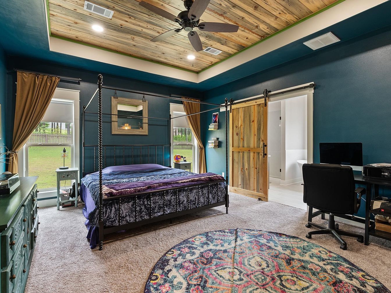 This bedroom features deep teal walls accented by a natural wood plank ceiling that adds warmth and texture to the space. A black four-poster bed dominates the room, dressed in dark bedding which contrasts dramatically with the soft beige carpet. Two tall windows flank the bed, dressed with brown curtains, inviting natural light while framing the outdoor greenery. A sliding barn door crafted from rustic wood leads to an adjoining bathroom, enhancing the room’s cozy charm. The corner holds a functional office nook consisting of a black desk and chair, blending productivity with relaxation seamlessly. A vibrant, patterned round rug adds a burst of color and intricate detail to the neutral flooring, tying the room’s elements together thoughtfully.