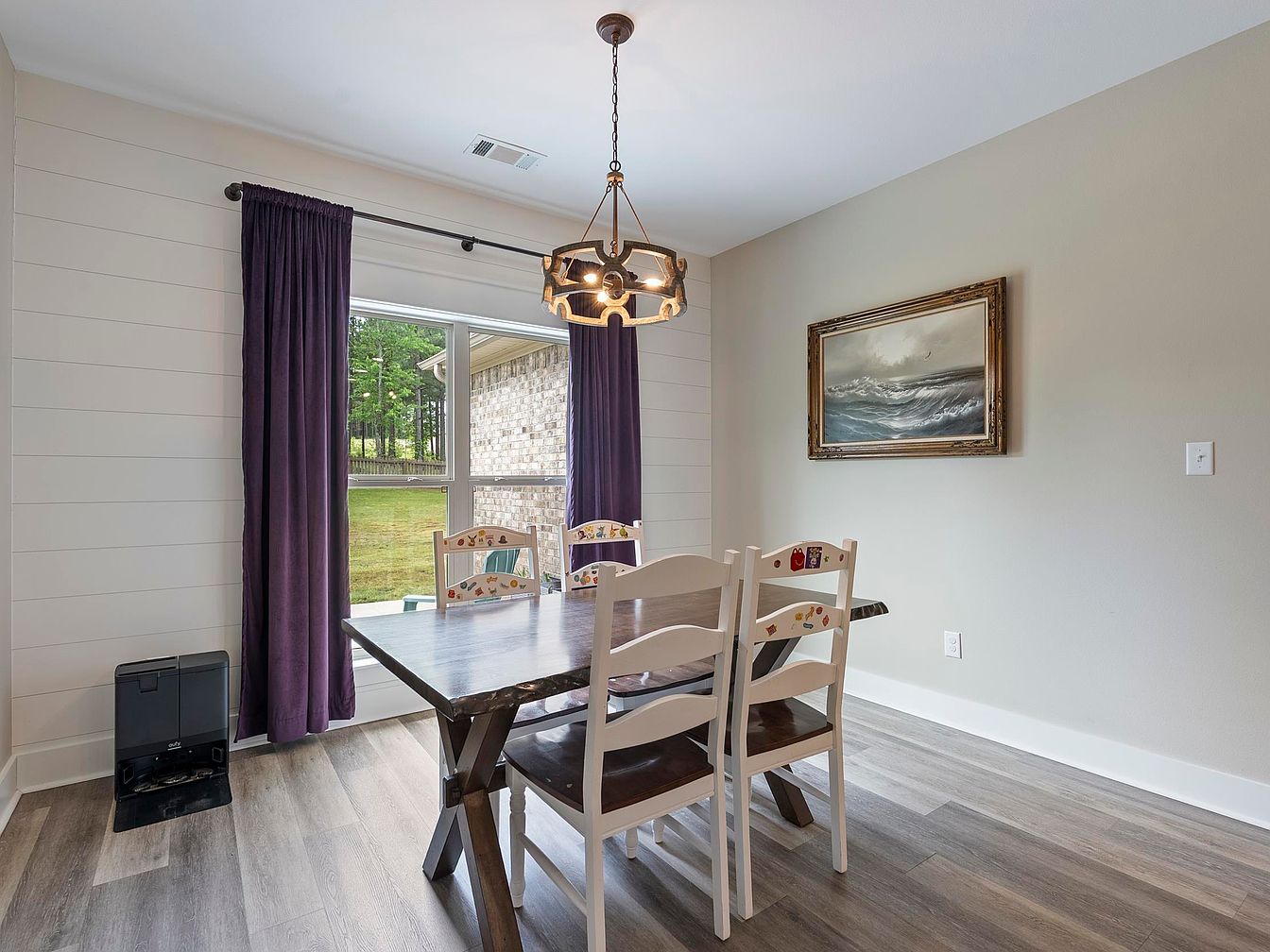 This dining area features a warm, inviting space with a modern farmhouse touch. The centerpiece is a sturdy wooden dining table with an X-frame base, paired with white chairs adorned with colorful decorative accents on the backrests, adding a playful, personal touch. The flooring is a light gray wood-look laminate which blends seamlessly with the neutral pale gray walls. A large window framed by deep purple curtains provides natural light and views of the neighboring yard. Above the table hangs a unique circular chandelier with an industrial-rustic design. A framed seascape painting adds artistic character to the otherwise minimalist wall.