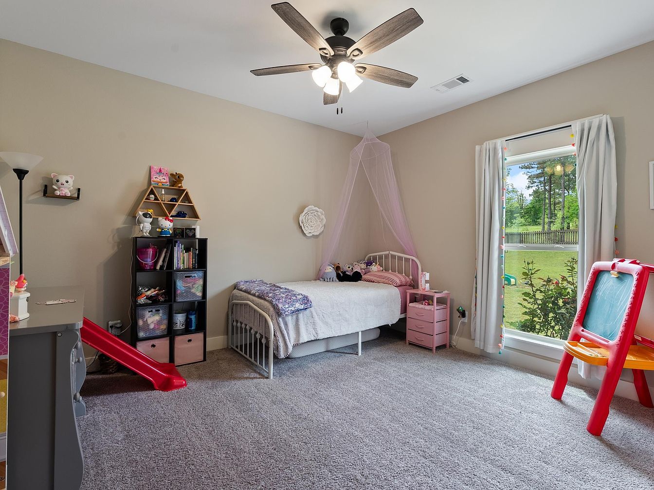 This cheerful child’s bedroom features soft beige walls and plush light gray carpeting, creating a cozy and calm environment. A small white twin bed is adorned with a pink canopy and a cozy quilt, accompanied by a compact pink nightstand. A black cubby shelf unit holds toys and books, topped with playful collectibles. Ample natural light streams in from a large window dressed with simple white curtains, framing a view of the greenery outside. A ceiling fan with wooden blades adds functionality. The room also includes a vibrant red play slide and a colorful easel, enhancing the playful, inviting atmosphere.