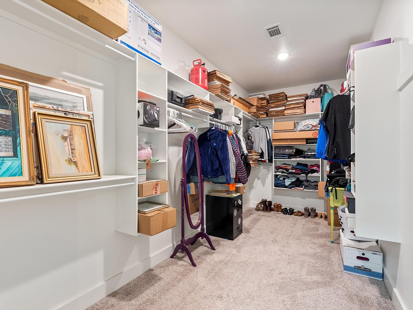 This spacious walk-in closet features an organized layout with white built-in shelving and hanging rods on both sides. Clothes are neatly hung alongside folded garments on open shelves at the back wall. The color scheme is subdued, primarily white and neutral tones with a beige carpeted floor adding warmth to the room. Various boxes and items are stored on the top shelves, while personal items and framed artwork lean against the walls and shelves, indicating multifunctional use. A full standing mirror in a dark purple frame provides a stylish contrast and functional touch within the clean, practical space.
